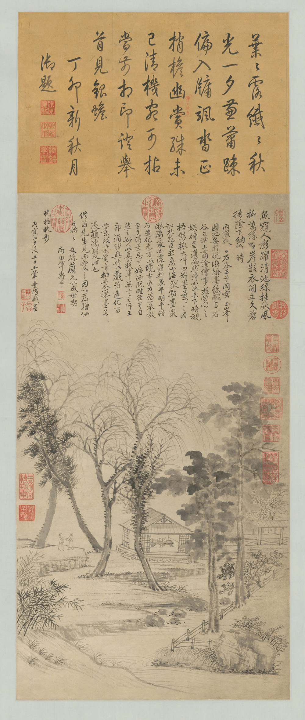 从恽寿平的题诗来看,此图应为写实之作。图中墨笔绘池上高梧疏柳掩映画堂,坡头二人对语。笔法松秀,意境淡远。在王翚众多的摹古、仿古的宏篇巨制中,此种写实的园林小品犹显清新可喜。恽寿平题:鱼窥人影跃清池 , 绿挂秋风柳万丝。石岸散衣闲立久 , 碧悟阴下纳凉时。