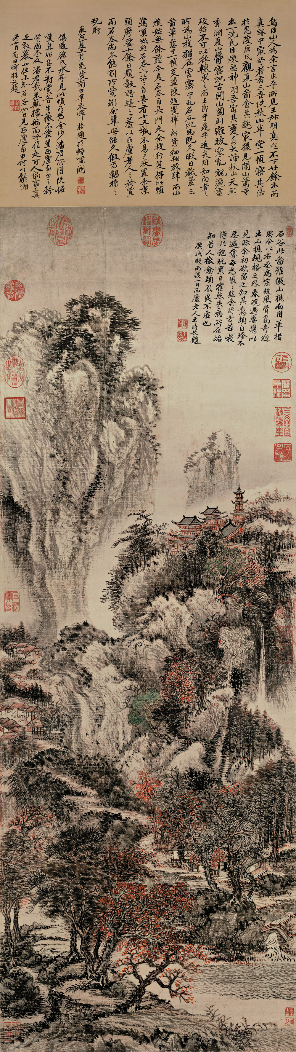 王时敏题款:“石谷此图,虽仿山樵,而用笔措施,全以右丞为宗,故风格高奇,回出山樵规格之外。春晚过娄,横以见示,余初欲留之,知其意颇自珍,不忍遽夺,每为怅怅。然余时方苦嗽,得此饱玩累日,霍然失病所在,始知昔人檄愈头风,良不虚也。庚戌谷雨后一日西庐老人王时敏题。”