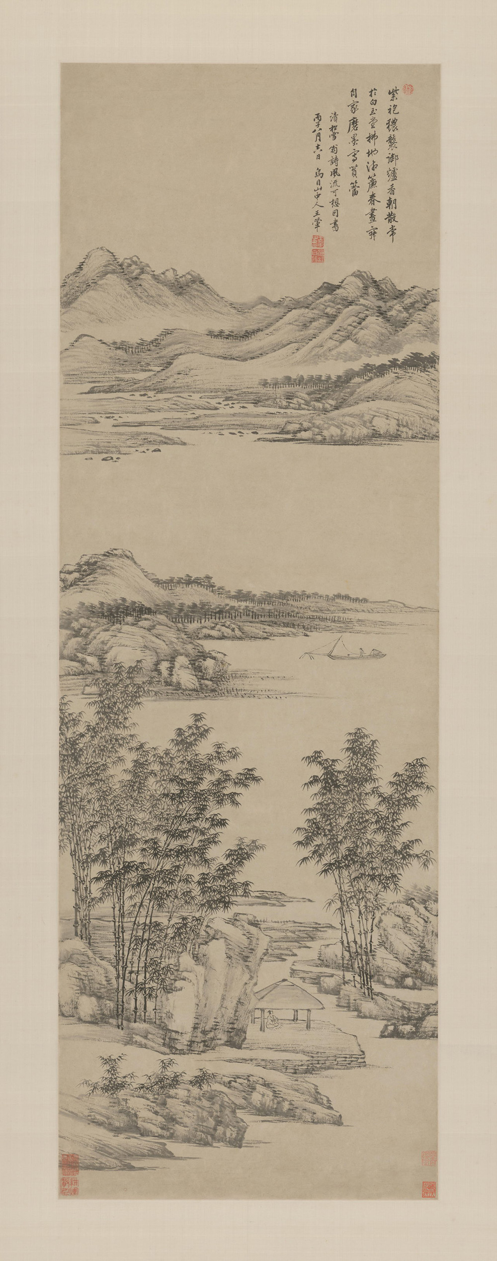 画中近景为竹林掩映下的草堂,中有游客寒江独钓,远景为山。这幅寒林山水有南宗笔墨、北宗丘壑的新面貌,技法精巧,清丽工秀,风格独特。