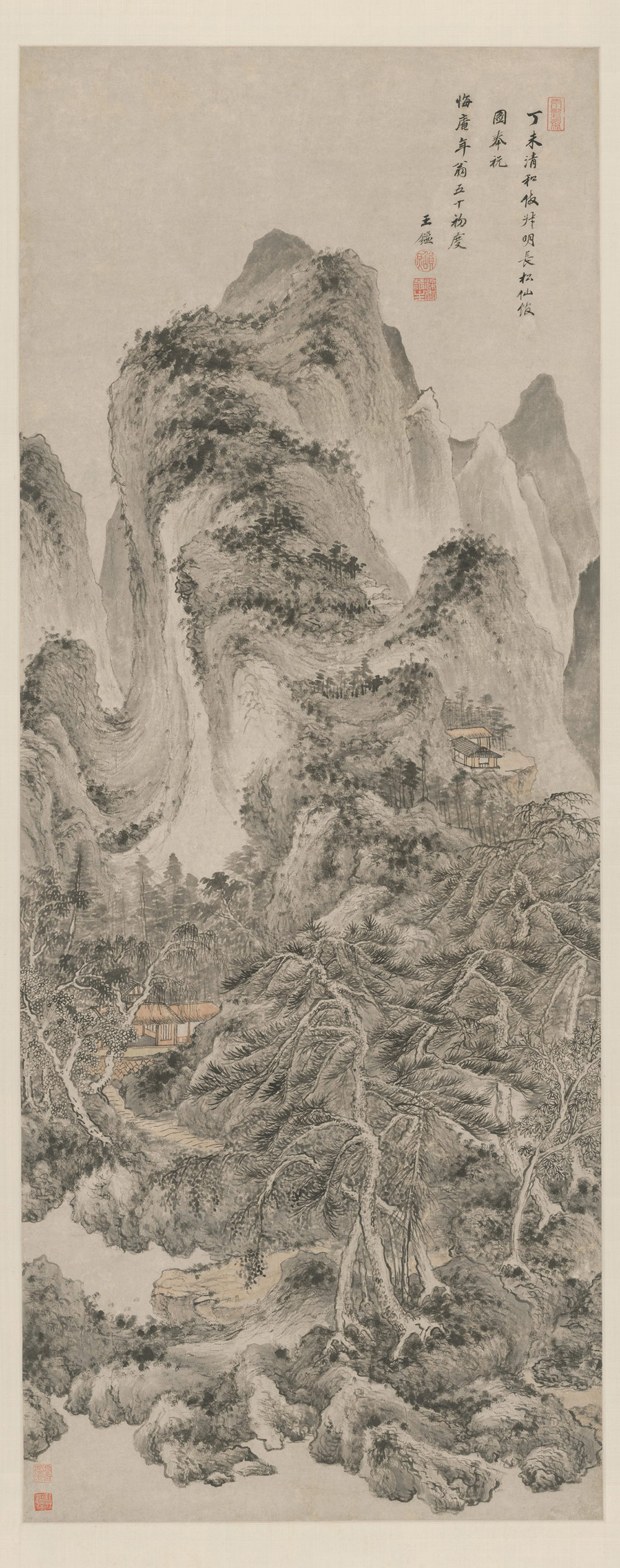 本幅自题:“丁未清和,仿叔明長松仙館圖,奉祝悔庵年翁50初度,王鑒。”此图是王鉴为友人尤侗祝寿所作,图中景物青松喻长寿,仙馆喻雅适之意。款识下钤“圆照”、“染香庵主”两印。丁未为清康熙六年(1667年)。