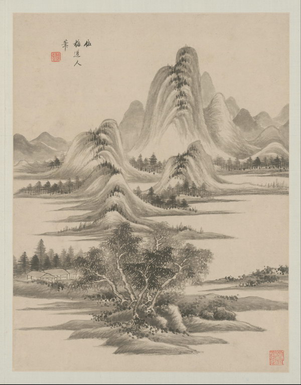 第六开:临赵雍山水。画心左上自题:“临仲穆。”钤“鉴”(朱文)印。