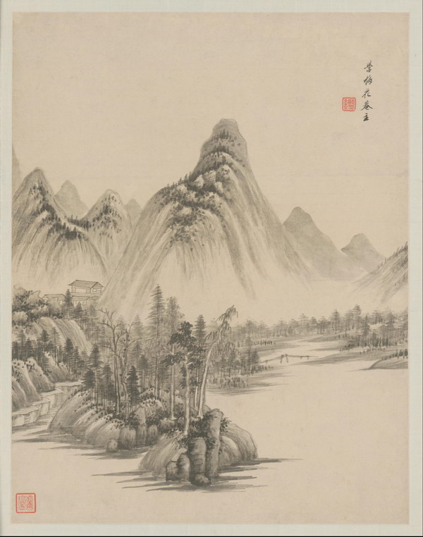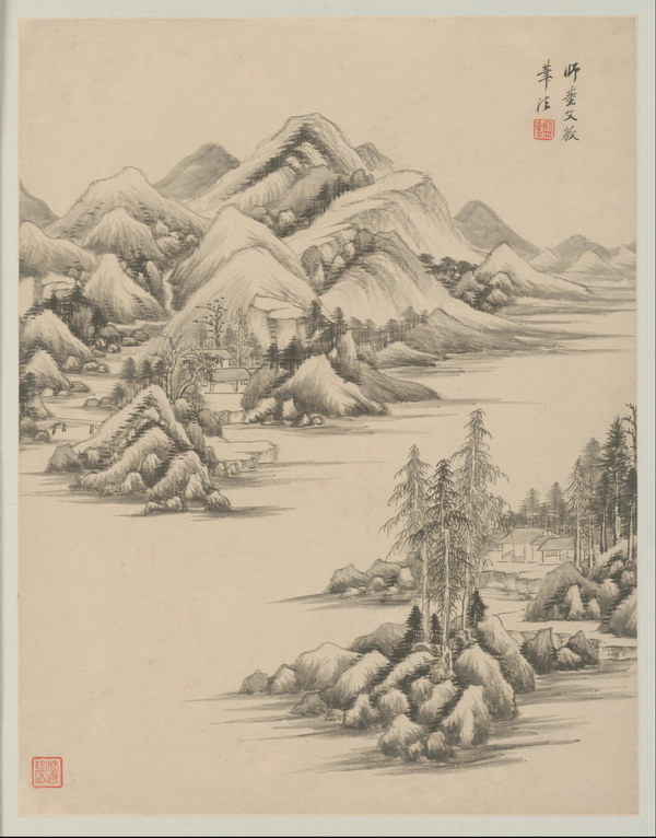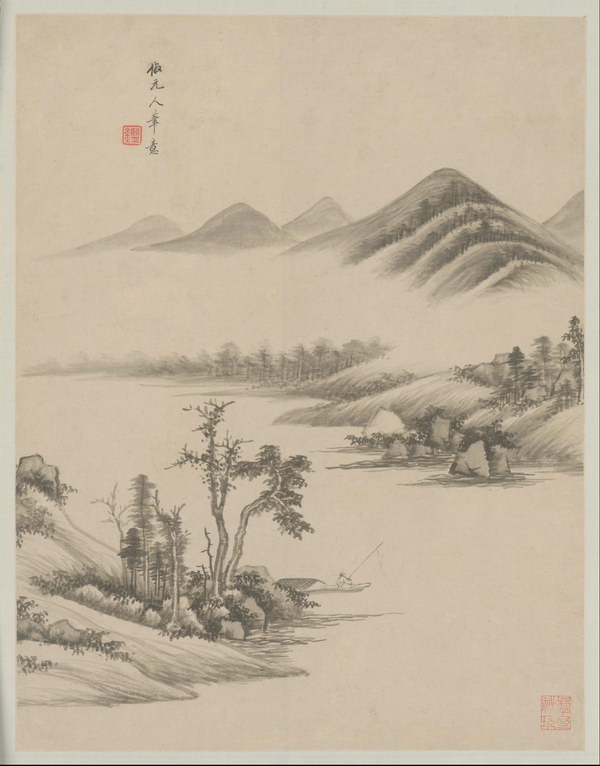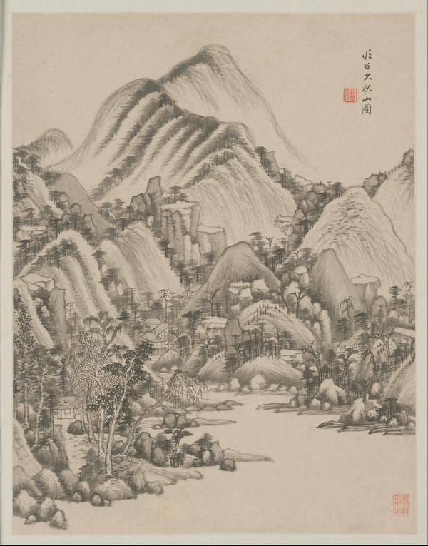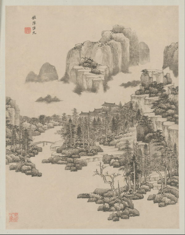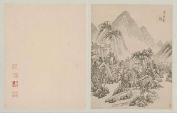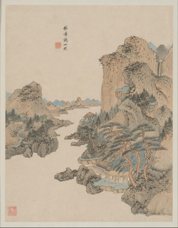 据自题,该册原有十二开,现仅存十开,分别仿赵伯驹、惠崇、倪瓒、黄公望、吴镇、赵雍、王蒙、范宽、赵伯驹和李成。
