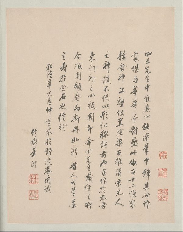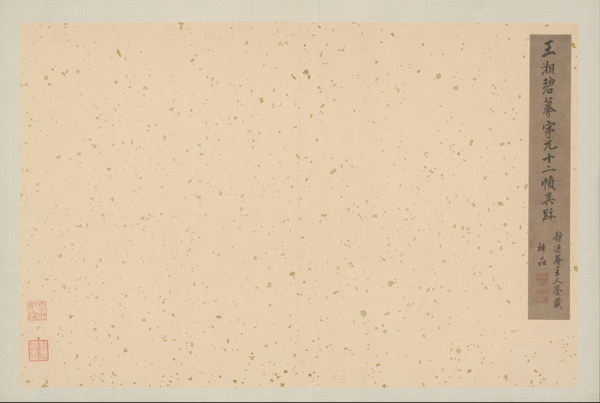 第十开左页自题:“余甲午年浪游长安,得纵观收藏家法书名画,如入武陵桃花源,归而似梦初醒,挂一漏万。闲坐无聊,偶记其一二,戏将绢素写之,共得十二帧,装成一册,以当卧游,未可示人,徒增捧腹。癸卯夏仲画于染香菴中,王鉴。”钤“王鉴之印”(白文)“圆照”(朱文)“湘碧”(朱文)印。