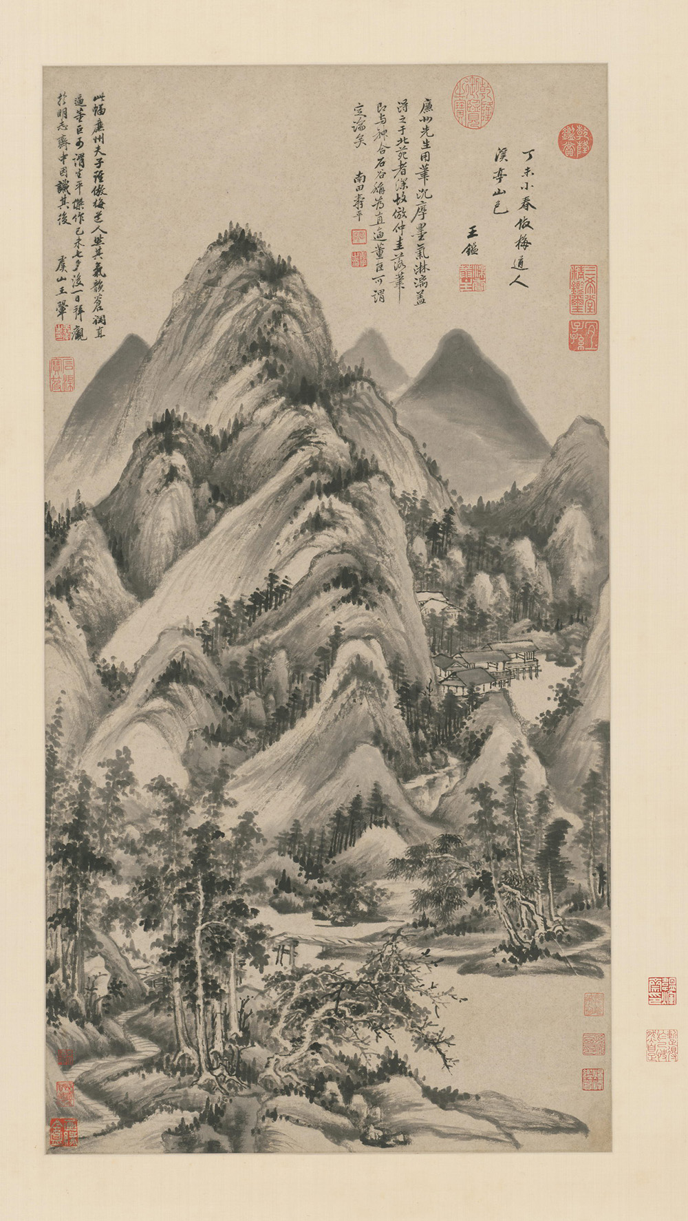 此图是王鉴仿吴镇(梅道人)《溪亭山色图》之作。图中峰峦浑厚,枫林青柏,山间云气蒸腾,给人以秋高气爽、心旷神怡之感。构图疏密有致,远近景互衬互映。本幅自题:“丁未小春仿梅道人《溪亭山色图》,王鉴。”钤“染香庵主”白文印。本幅有王翚、恽寿平题,钤“王翚之印”、“寿平之印”等。鉴藏印有:“乾隆御览之宝”、“乾隆鉴赏”等诸方。