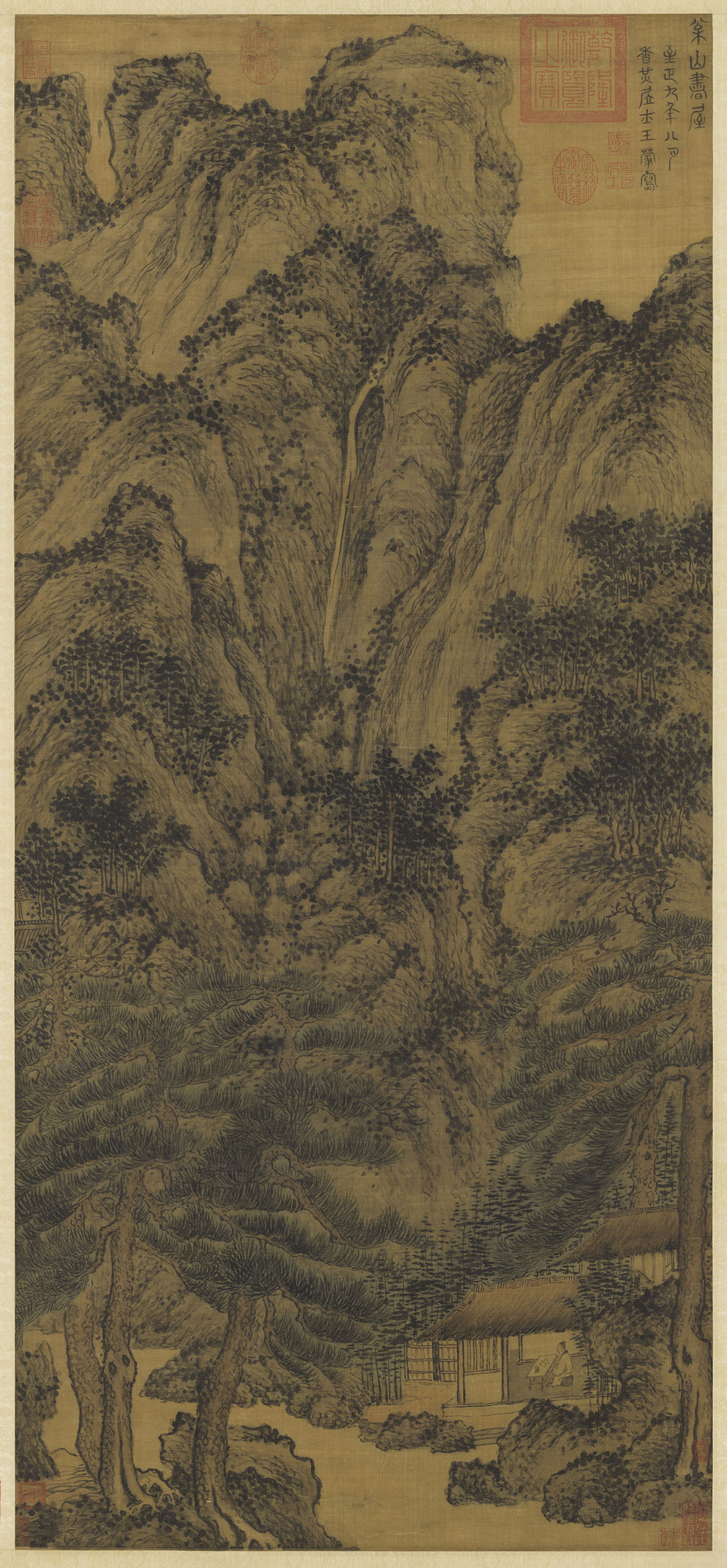 山峦重叠,以干笔牛毛皴皴擦,松林杂树,蓊蓊郁郁,几密不透风,高士一人,展卷于茅屋中,左上角以小篆题曰[松山书屋],通幅画作与题识方式,均展现王蒙古拙圆浑的笔韵。完成于至正九年,是王蒙四十二岁之作。松山书屋,至正九年八月香光居士王蒙写。王蒙印、香光居士。清内府诸鉴藏玺。