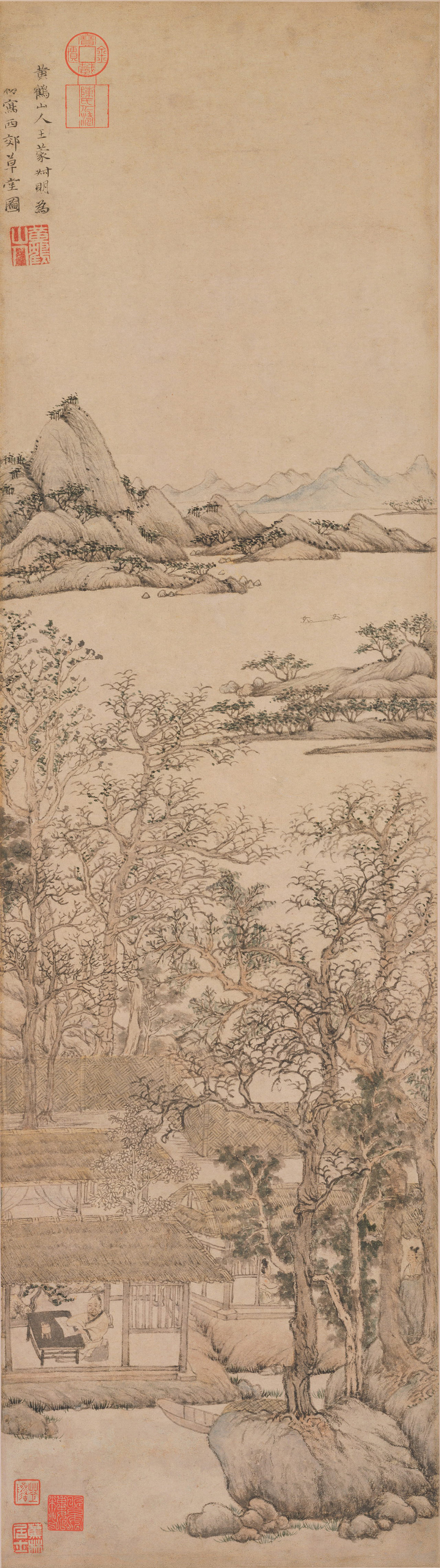 画幅左上自识“黄鹤山人王蒙叔明为写西郊草堂图”,下钤“黄鹤山人”白文方印。该幅远钤有“蕉林居士”、“泽山珍藏”、“筠阴居士”等鉴藏印多方。
