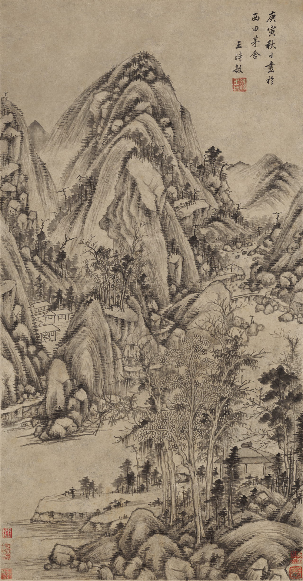 绘山峰高耸,山峦连绵,山涧中屋舍掩映,自远处一条水流蜿蜒而下,汇集于山脚,岸边古亭独立,杂树成林。画中笔法隽秀,境界虚和。自题:庚寅秋日画于西田茅舍,王时敏。