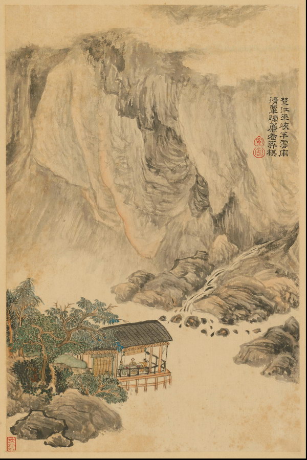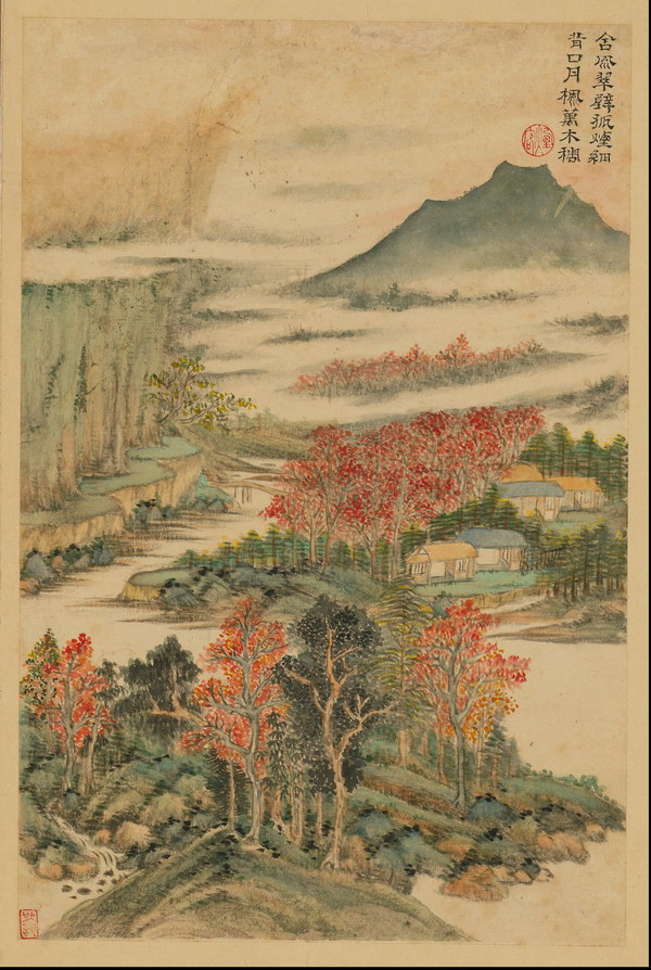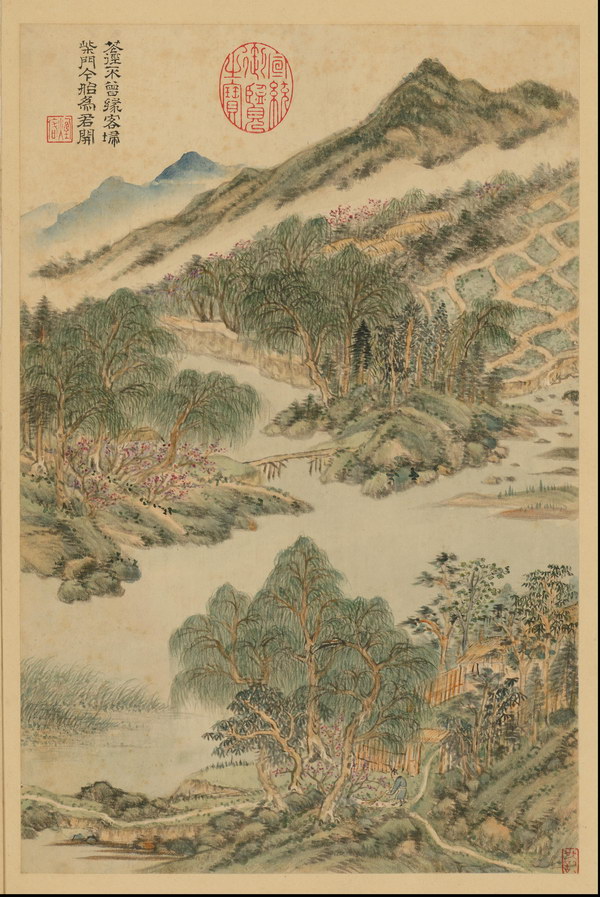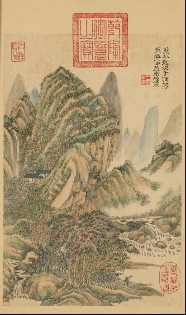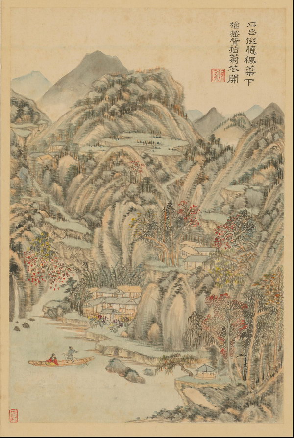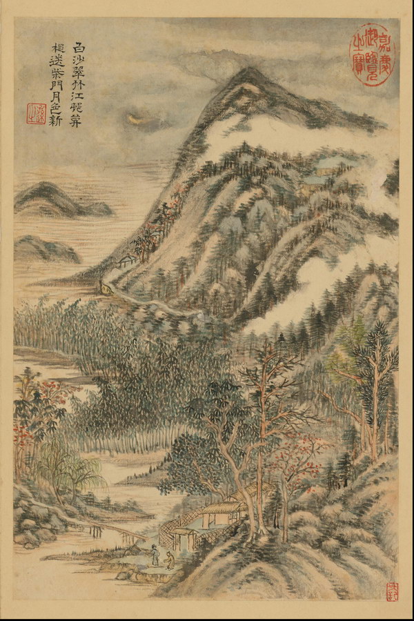 图册十二开,每开隶书杜诗二句。其中第一开“藍水遠從千澗落,玉山高並兩峰寒”,小青绿写夏日景色,小全景式构图,略学宋人,山崖壁立,茂树葱笼,飞瀑直泻。近景为长松翠竹,一渔人自溪中泊舟而归,负网沿山径走向山坳中隐现的两间瓦屋,一片山明水秀,景色怡人。第二开“白沙翠竹江村暮,相送柴門月色新。”画暮色迷蒙,新月如钩,峰峦、平湖、茂竹都被薄云雾气所笼罩。临溪草堂,柴门前二友人依依话别,意境深幽。全图纯以湿笔绘成,苍润中富清秀,诗画相应,可观,可游,可居。