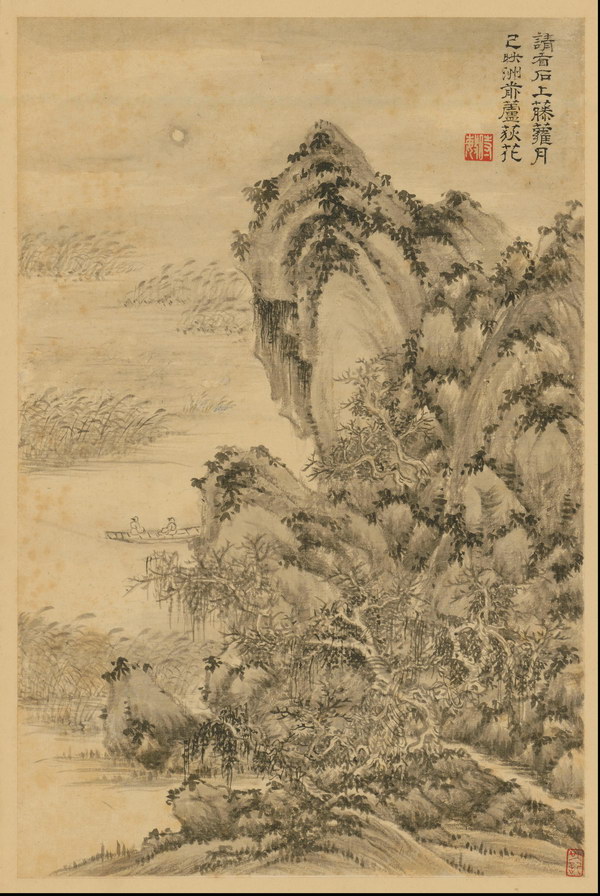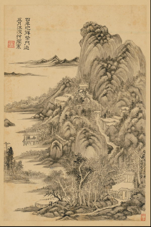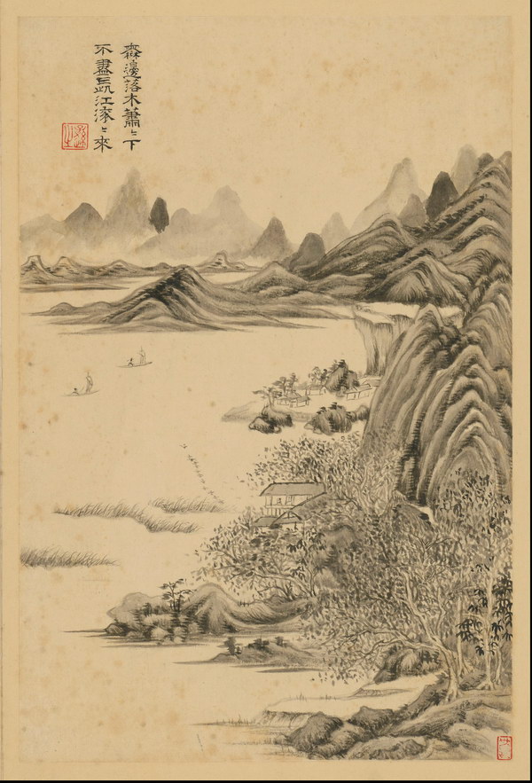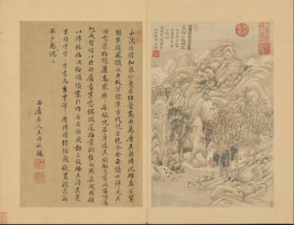 此册是依据杜甫诗意,为外甥董旭咸绘制的。王时敏作画,极力主张恢复古法,反对自出新意,曾自白:“迩来画道衰谮,古法渐湮,人多自出新意,谬种流传,遂至邪诡不可救挽。”(《西庐画跋》)无论大轴巨幛,还是扇页小品,俱要“略不失古人面目”,对元代山水画大师黄公望更为心折,此册亦不例外,但在笔墨技法上,不独仿黄公望,也融汇了董源、巨然、王蒙诸家,组合成自己的面貌,和其他单纯摹古的作品相比,显出难得的生动随意。