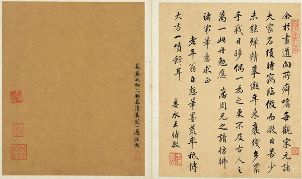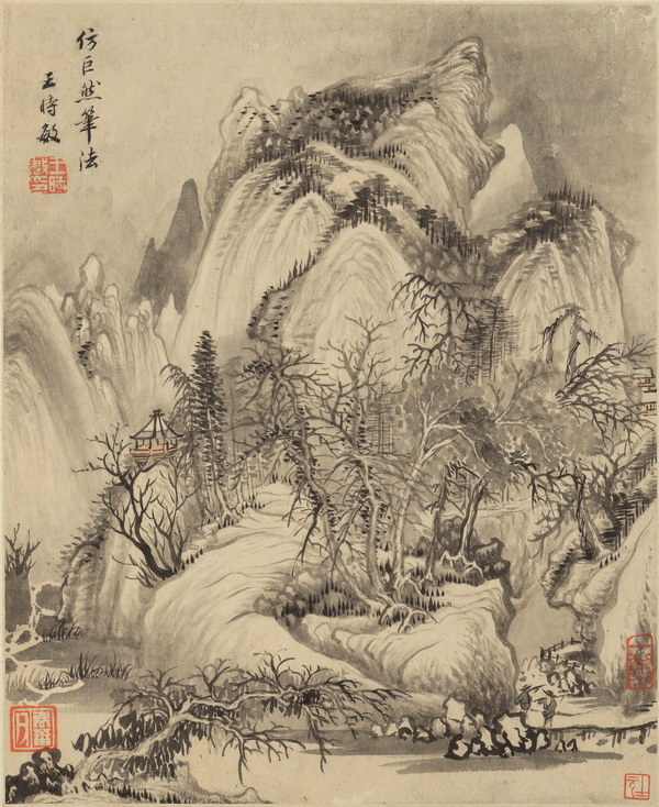 此册系王时敏临仿诸家笔法,精润入古,诚烟客精品册页。其自题:余于画道向所癖嗜,每观宋元诸大家名迹时窃临仿,而睱日苦少,未能殚精摹拟,年来衰残多累,手战目眵,偶一为之,更不及古人之万一,此册勉应藩周兄之请,仿佛诸家笔意求正。