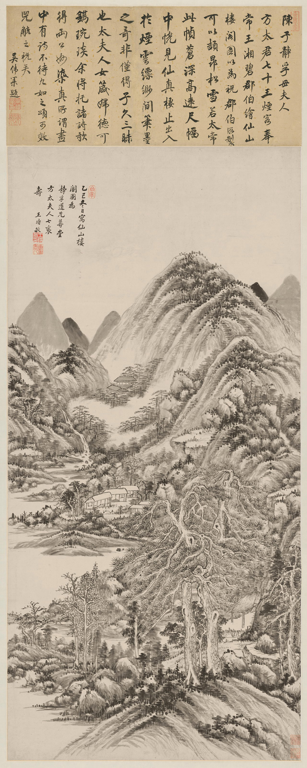 自识:“乙巳冬日,写仙山楼阁图,为静孚道兄尊堂方太夫人七秩寿。王时敏。”钤“王时敏印”、“西庐老人”、“玄赏”印。