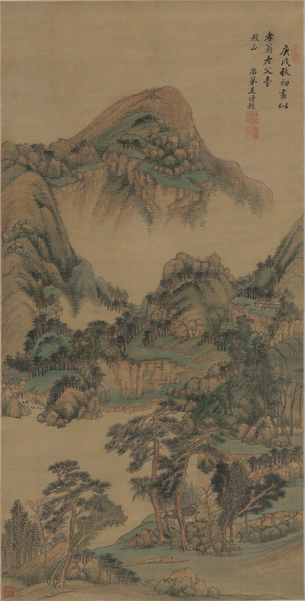 以”高远”法取势,构图呈”S”形循环上升。山石沉浑雄健,树木苍厚繁密,画风凝重古朴。近景松树松枝翠绿,枝干姿态各异。中景山体险要,重峦叠嶂。远景中间,山峰如柱,是整个画面的气魄所在。山石沉浑雄健,树木苍厚繁密,画风凝重古朴。