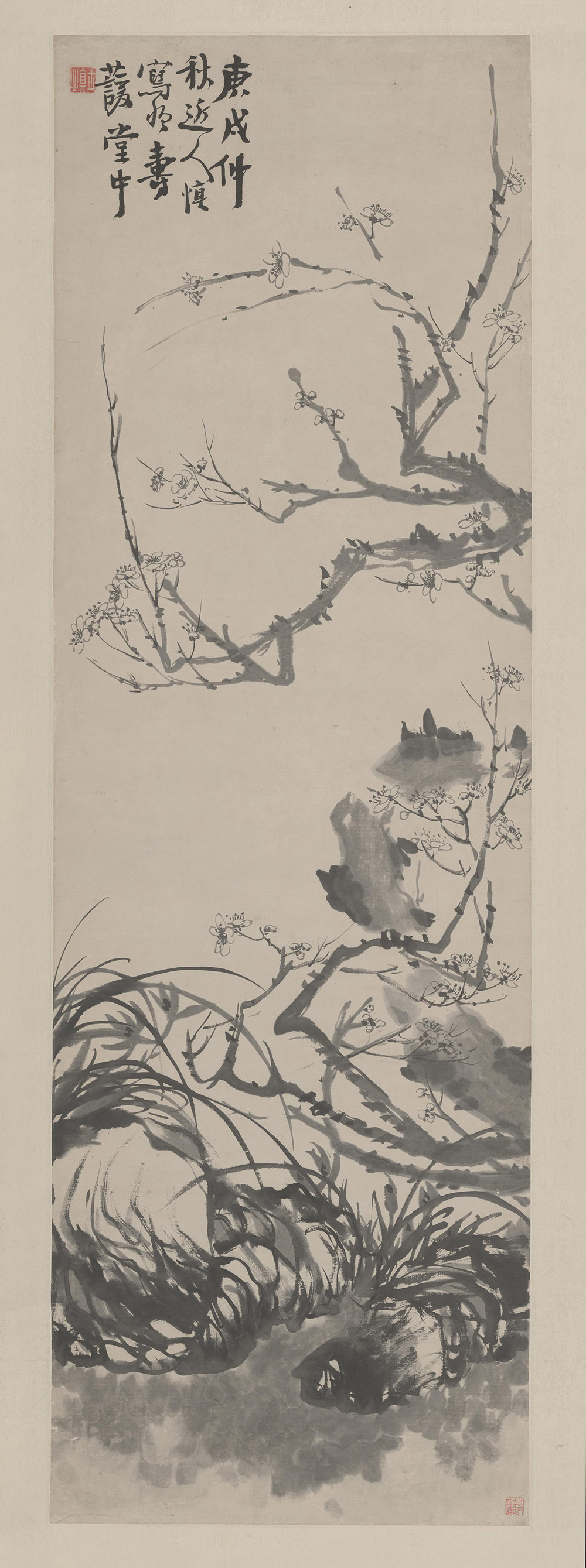 图绘春风中兰叶翻飞、梅花初绽的景致。拳石、梅树和丛兰以豪放的笔墨一挥而就,淋漓酣畅的墨气与梅兰旺盛勃发的生命力相符相合。梅花以工细的线条勾勒,俏丽的花姿显现出梅树清幽典雅的风韵和“空里疏香”的诗意。
