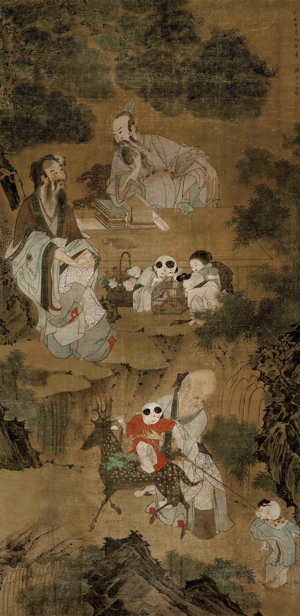 绘画题材为常见的祝寿图,寿星和梅花鹿是这一题材必备的图像,婴戏图表示多子,也代表了吉祥的寓意,除此之外本图中还描绘了对坐书案的两位文仕,为本图平添了高雅的情趣。画面设色妍雅,笔墨生动。
