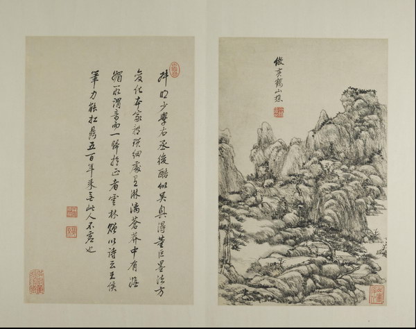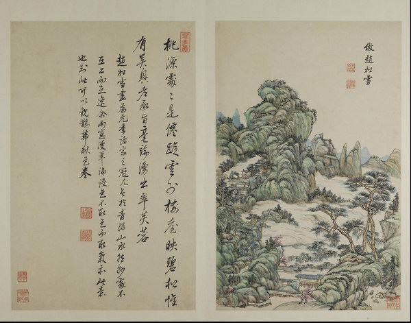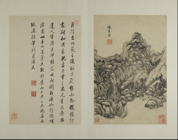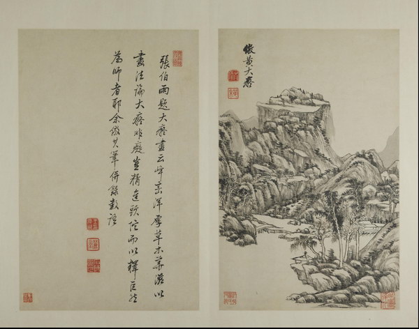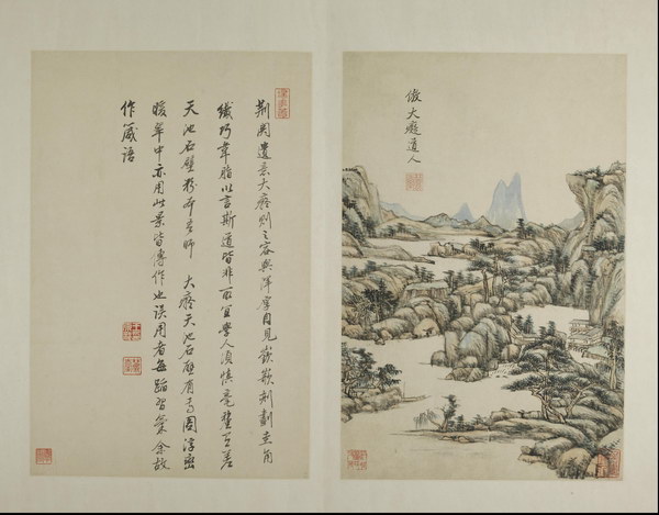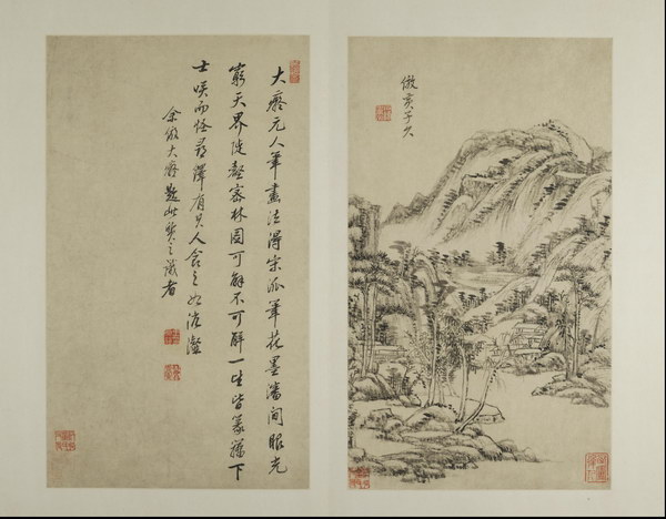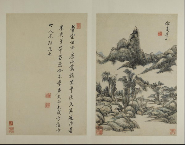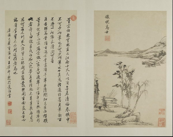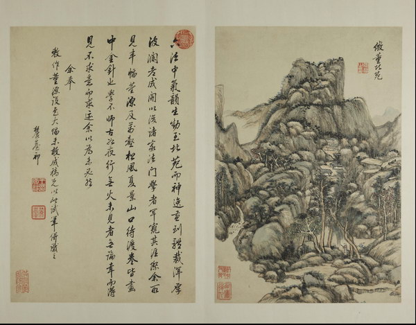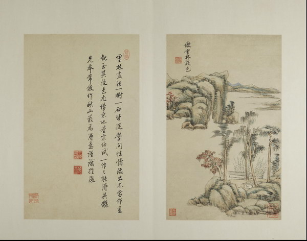 此册是王原祁为其外甥兼弟子李为宪(字匡吉)所作。画面绘制精美,笔墨纯厚自然、设色自如,对题是王原祁临习四十年后对宋元诸家的感悟及 “六法” 的总结,全面涉及了山水画的丘壑布置、笔、墨、设色等技法,再次强调了 “气韵生动”的宗旨。