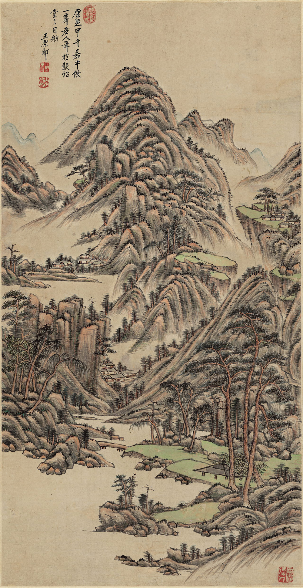 此图仿元代画家黄公望画意所绘,山峰连绵,树木苍翠,一派山水雄壮之姿。题识:康熙甲午嘉平,仿一峰老人笔于谷诒堂之目舫。