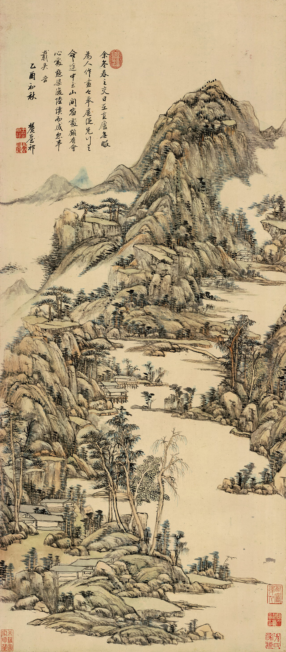 此画写重山复岭,纵向逶迤,松溪水榭,亭桥山居,错落其间,层次深远。构图平中带险,笔法秀劲,气韵苍润,色调沉着凝重,不失为晚年之佳作。