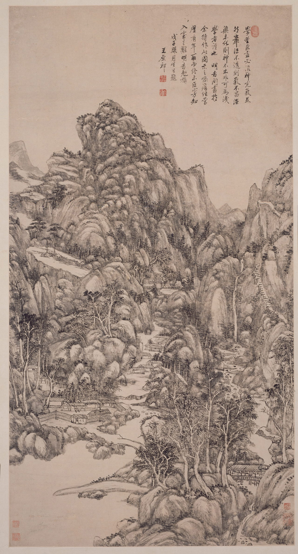 款识:“学董、巨画必须神完气足。然章法不透则气不昌,渲染未化则神不出,非可为浅学者语也。 明吉问画于余,特作此图示之。惨淡经营,历有年所,而终未匠心,方知入室之难。明吉勉旃。 戊子腊月(1708年)望日题。王原祁。”