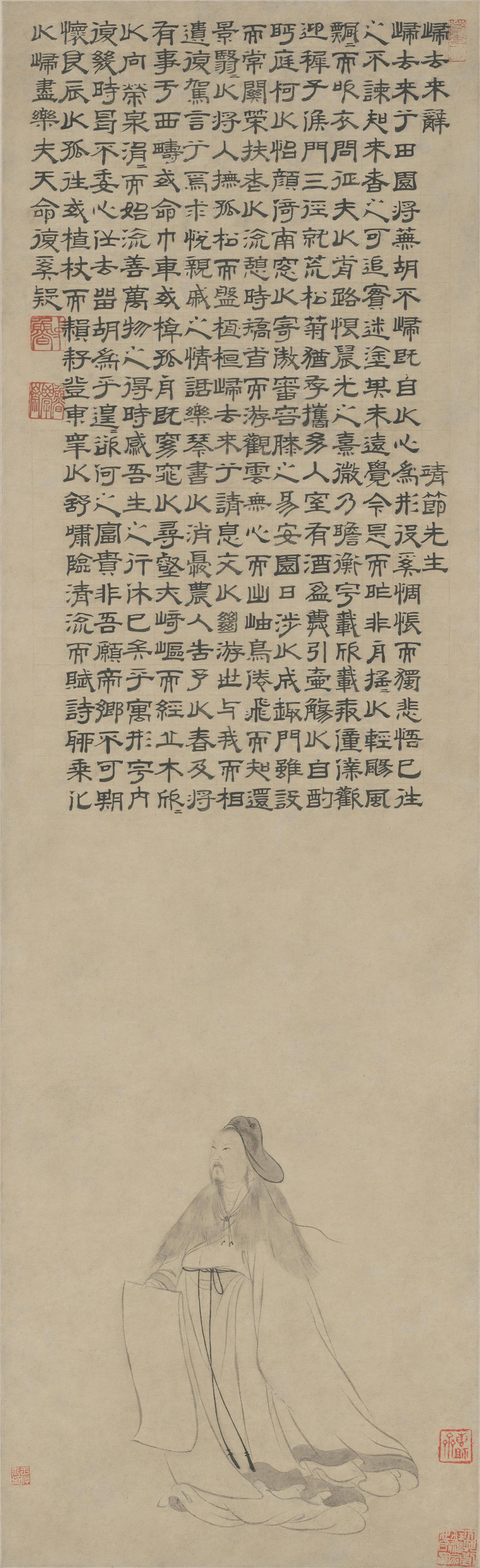 画幅上部隶书录东晋著名诗人陶渊明之辞赋名作《归去来辞》全文。下部绘陶渊明像,其手持长卷,目视远方,宽大的袍袖随风飘动,形象潇洒飘逸。画像用白描法,主要以淡墨勾画,其中偶施浓墨。五官以细线勾勒,刻画出人物从容安详的神态。衣纹线条以中锋、侧锋交替使用,具婉转流畅之势。作品以极简的笔法和构图表现出陶渊明辞官归隐无官一身轻后的愉悦神态及其一代名士的不凡气质。本幅无款署。左下方钤 “王仲玉印”。