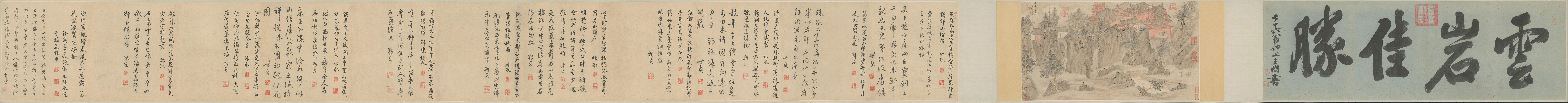 引首王问书“云岩佳胜”四字,尾纸有王书承、温冈、王世贞、陈冠、王锡爵题跋。此画绘于明隆庆二年(1568年)。
