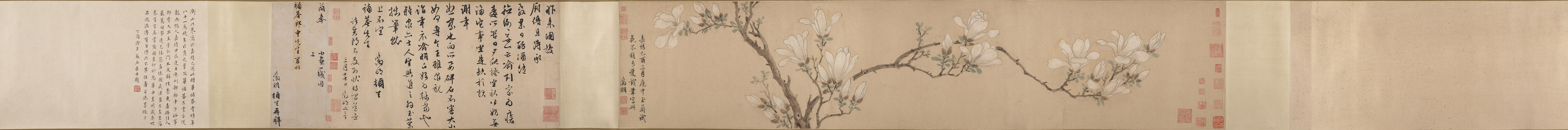 此卷绘一树白玉兰,一枝探出,生意盎然,似在晨露中散发幽香。文氏此幅不作精巧之笔,全以笔力取胜,诚写生之精品。