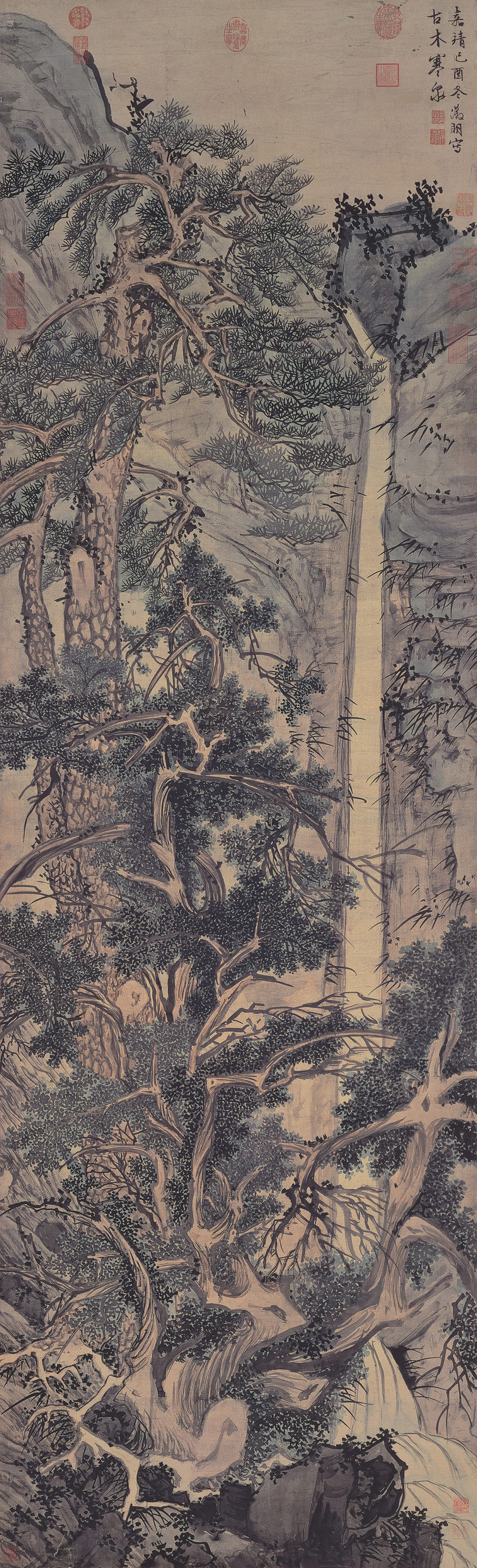 款识:嘉靖己酉(1549年)冬,徵明写古木寒泉。