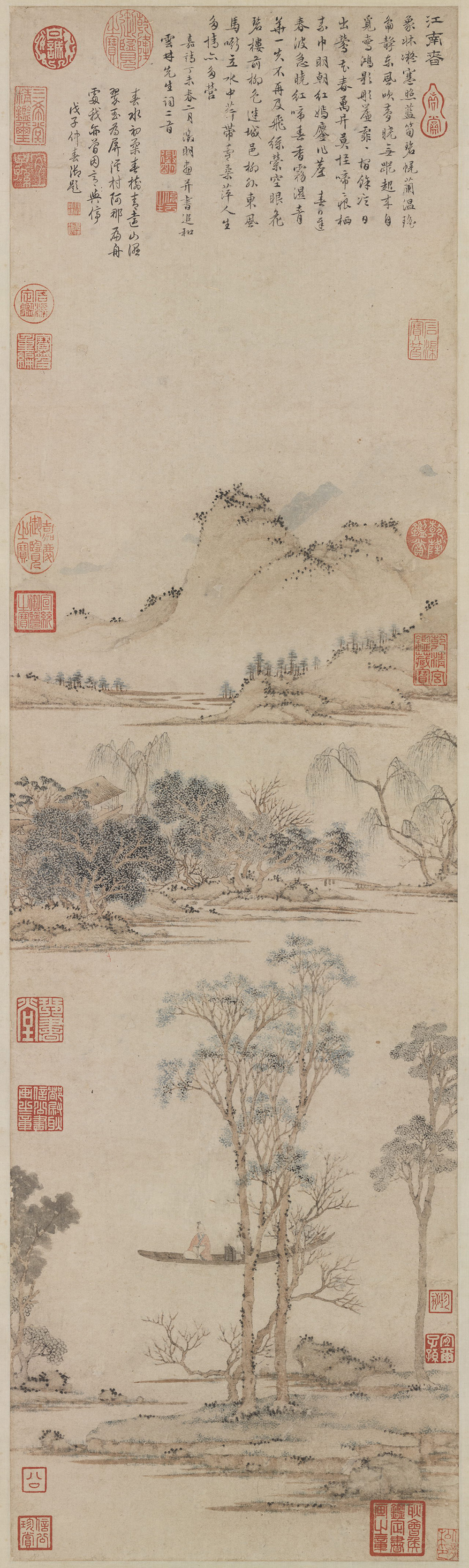 款识:文征明隶书款: 江南春。(八分书)。象床凝寒照蓝笋。碧幌兰温瑶鸭静。东风吹梦晓无踪。起来自觅惊鸿影。彤帘霏霏宿余冷。日出莺花春万井。莫怪啼痕栖素巾。明朝红嫣鏖作尘。春日迟。春波急。晓红啼春香雾湿。青华一失不再及。飞丝萦空眼花碧。楼前柳色迷城邑。柳外东风马嘶立。水中荇带牵柔萍。人生多情亦多营。嘉靖丁未(西元一五四七年)春二月。征明画。并书追和云林先生词二首。(行草书)。