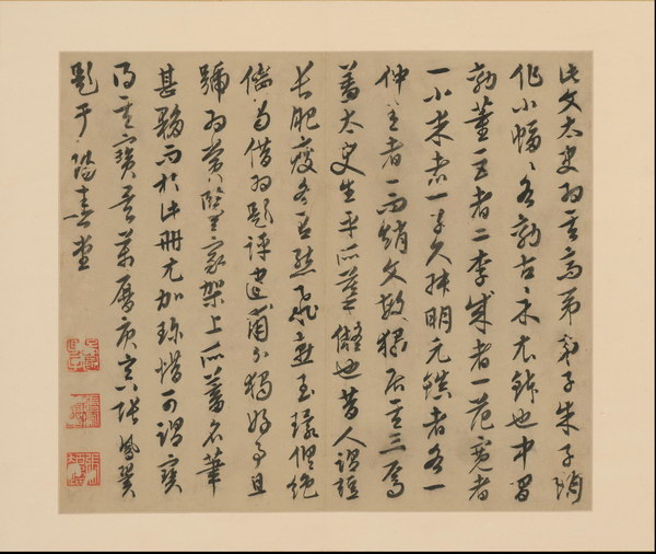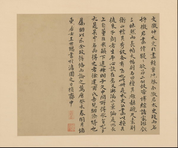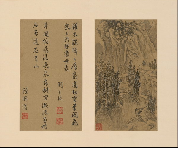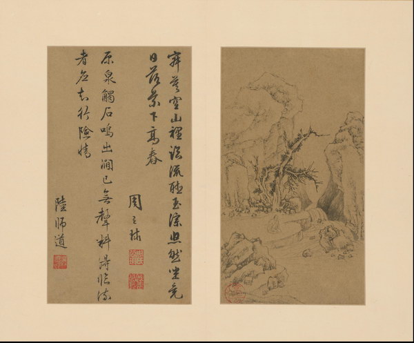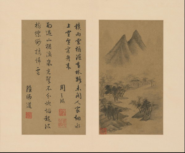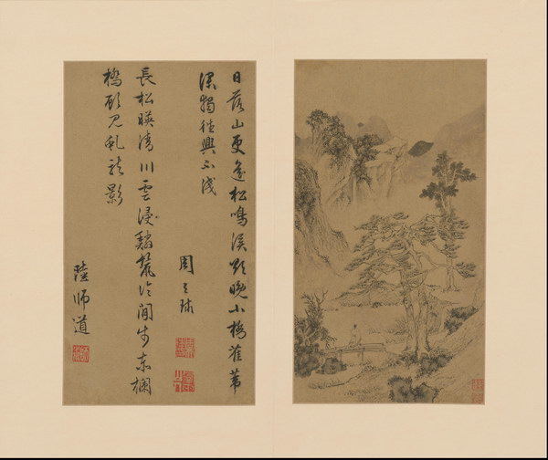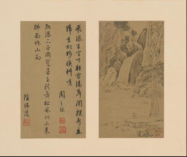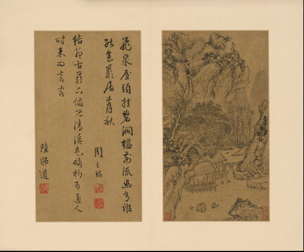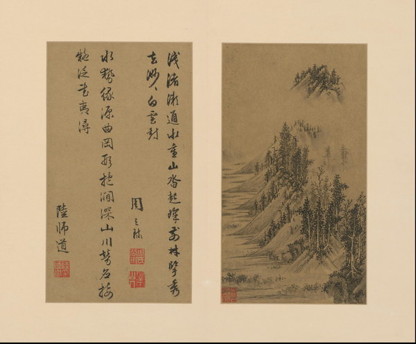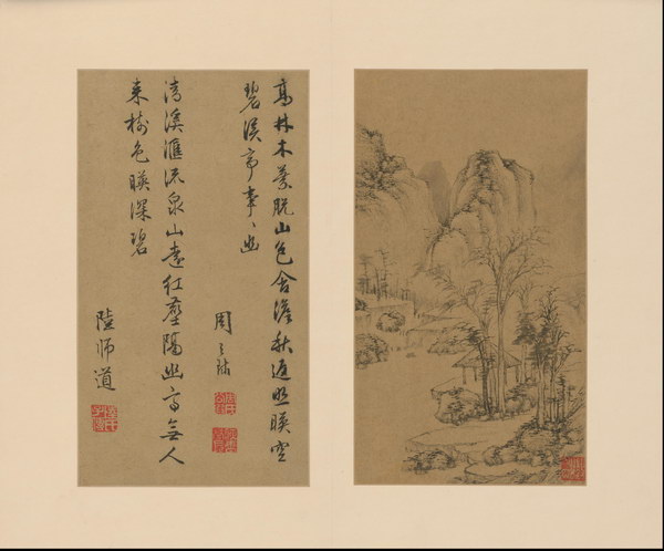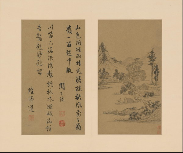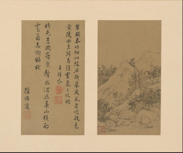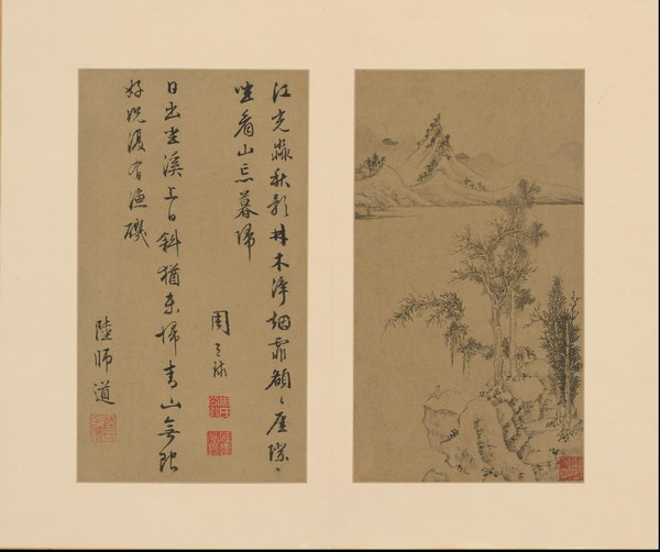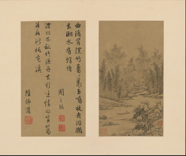 此水墨画,每段均有陆师道、周天球五律各一首,第十一段有王稺登书七律一首,陆氏五律一首,无周氏题诗。钤明陆师道,周天球、王稺登、张凤翼等印记,金梁《盛京书画录》著录。