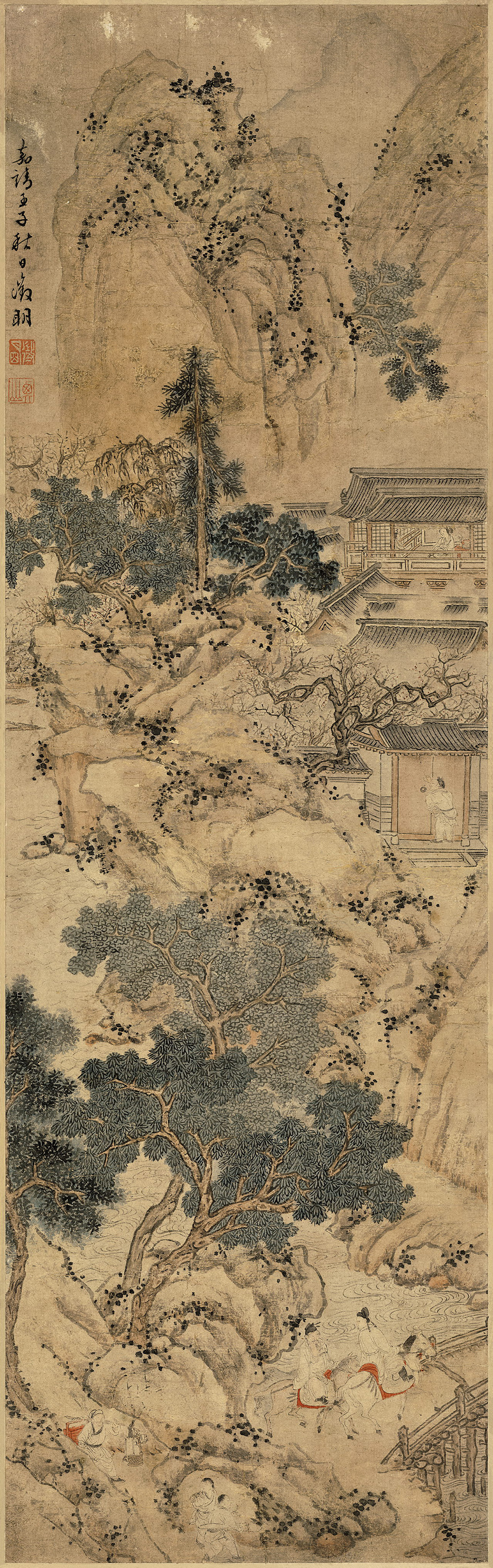描绘的是友人前来拜访的场景,远处山峦起伏,山谷中绿树苍劲,几座楼阁坐落于此,一人站在门外正待敲门;山脚下流水潺潺,数人忙碌。此幅山石皴染兼施,多有苔点,笔墨气魄洋溢,清秀雅致。