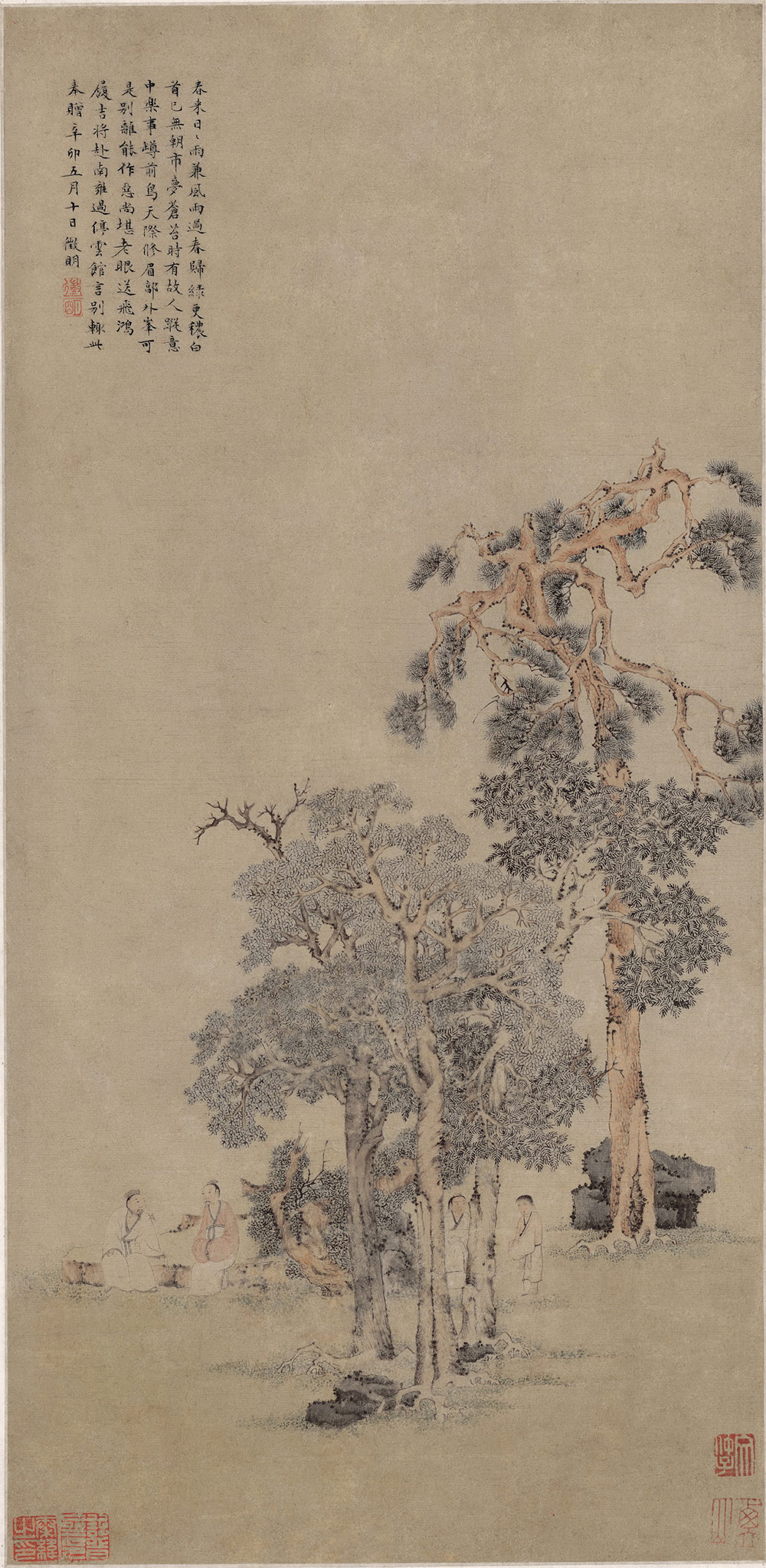 文徵明为送别老友王宠特意精心绘制的心仪之作。王宠出生于1494年,比文徵明小24岁,他们同是长洲人,又有相同的爱好,算是志同道合、情趣相投,所以两人的交往相当密切。另一个相同之处,就是两人的仕途都不顺风顺水,总是坎坷磨难,从而导致两人对仕途的绝望而乐于山水间,绘画、习字、吟诗、著书。整幅画面布局合理,人物、树木集中于左下方,给右上方留足了诗文与书法的空间,色彩着暗淡色,老树枯枝、怪石嶙峋,暗示着离别的不舍情愫和人老情意在的深厚情谊。一棵老松树靠在一块大石头旁,寓意创作者“我”已老朽,而另外的松树则显得苍翠挺拔,郁郁葱葱,这可能是期盼年轻的友人王宠奋发有为。