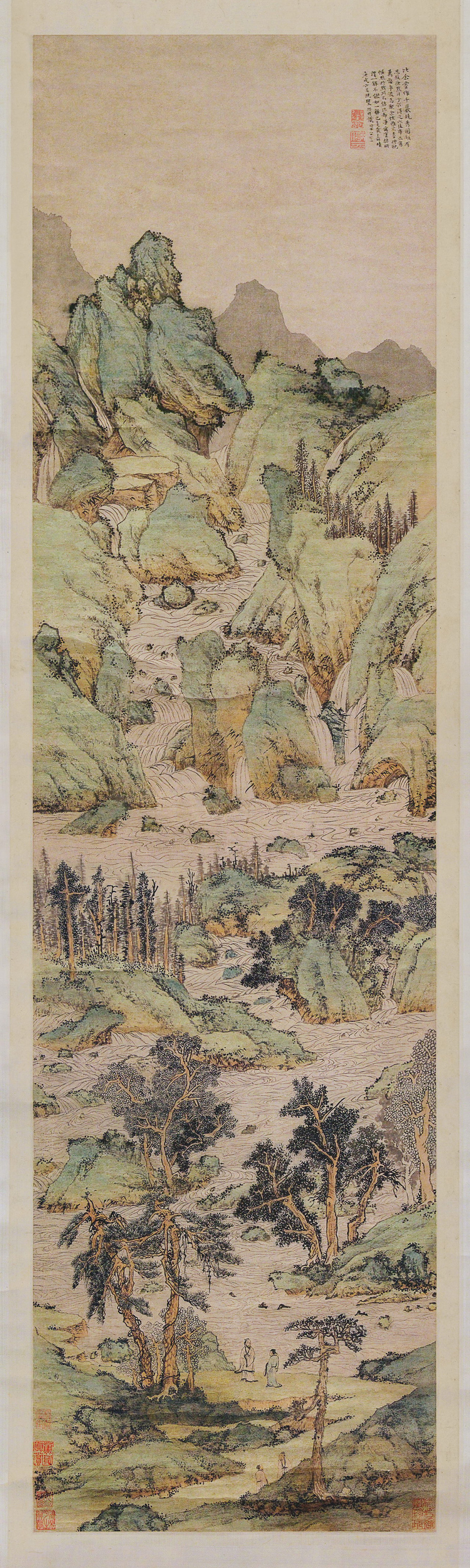 本幅布局取法元代王蒙,疏密相宜,层岩交叠,泉壑曲折,时而溪流涓涓,时而波澜演漾,生动空灵而富于韵律感。运笔沉着厚重,工稳蕴藉;赋色层次分明,古雅清润。