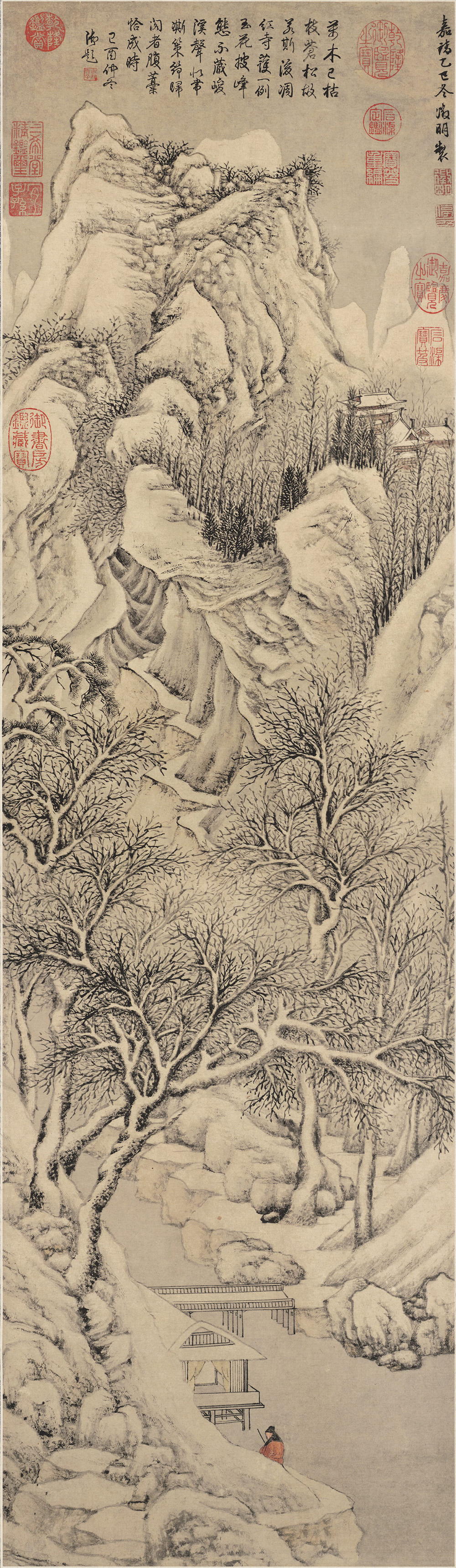 此图所绘雪景,在突出皑皑积雪同时,还强化了山石尖峭方硬之势,并增添犹如冰凝的倒挂石等,使山川冰、雪、险、寒俱备,形象地展现了冬天雪景的典型特色。在冰天雪地的崇山峻岭之中,却有人骑驴吟诗,有人策杖入洞,还建造着有人居住的屋宇、水阁,可想见这些幽人高士的雅兴之浓,其情怀诚如诗屮所云:“小蹇不嫌扫路冰,十分清思属吟鞍。”作品鲜明地传达出了明代中期吴中文人生活优裕、悠游山林的闲适雅逸情致,也反映了“吴派”文人绘画在思想内容上的显著特色。