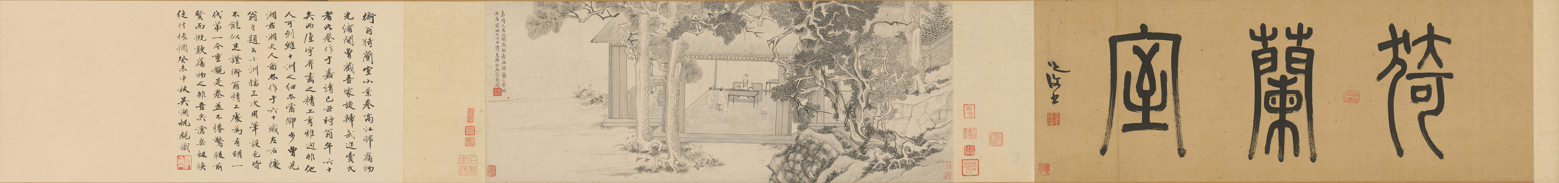本幅绘古松参天,古柏夭矫,环境幽谧。错杂分布的兰花点出了“猗兰室”的主题,室内主人操琴自娱,更进一步紧紧扣住了主题,颇见作者巧思。此图画法极为工细,树石用笔俊健秀逸,屋宇界画精工,是作者中晚期代表作品。