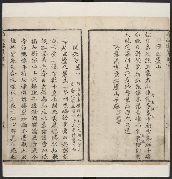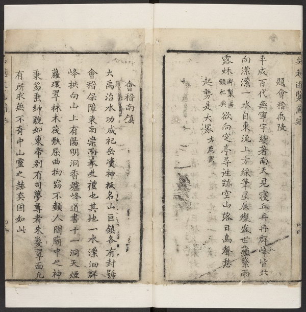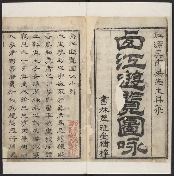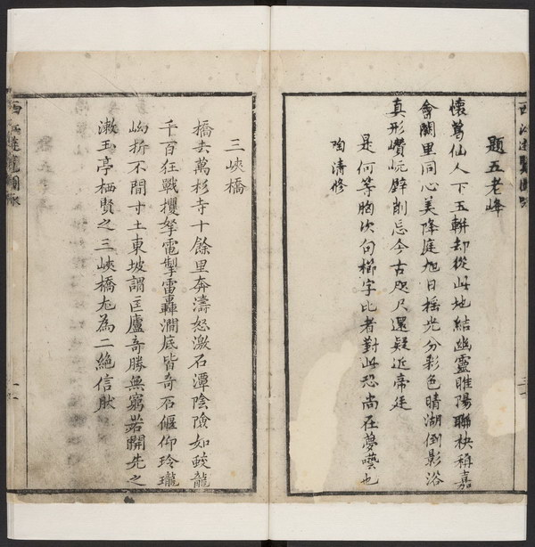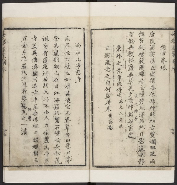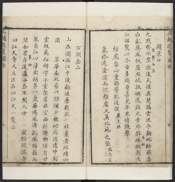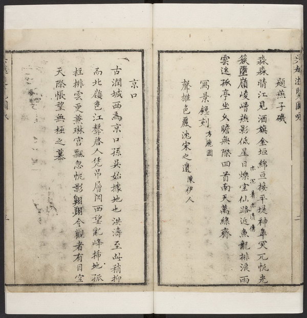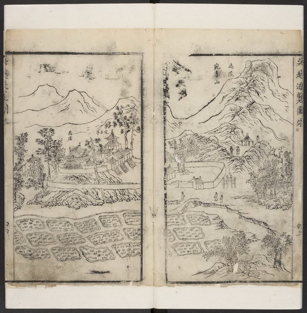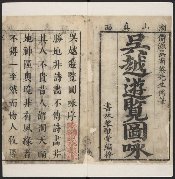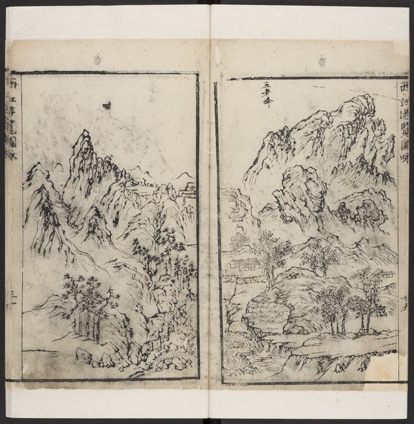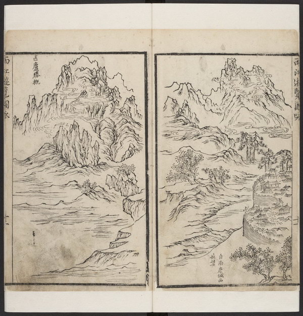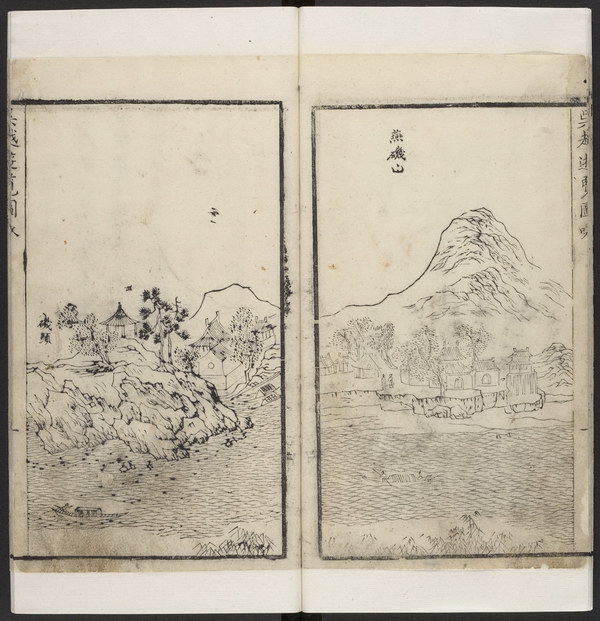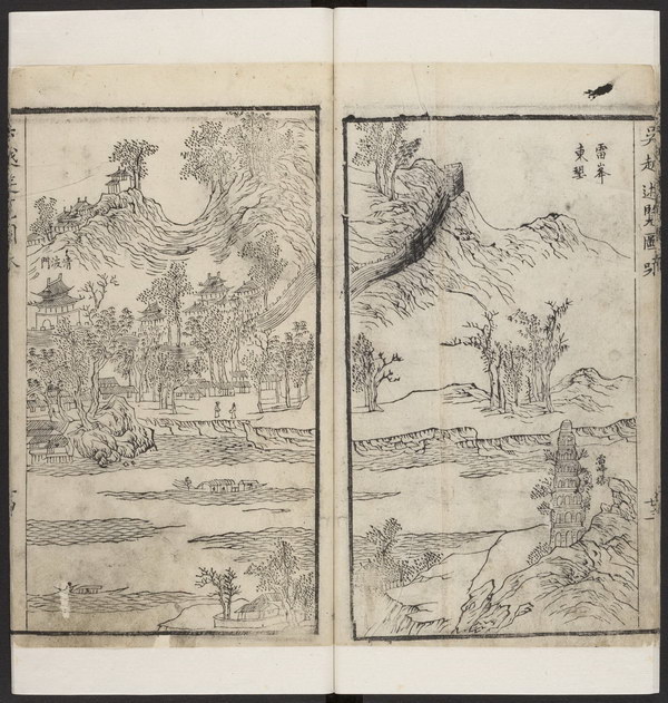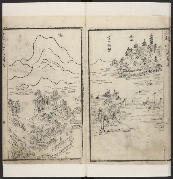 两本吴楚奇所绘吴越和西江地区的山水名胜、古迹、风物名胜。每图配以诗文,诗文为陈维所录,一图一文。河埠、山岗、树石、亭台、舟楫、人物等相互穿插,精心布置,披览之下,如身在画中。