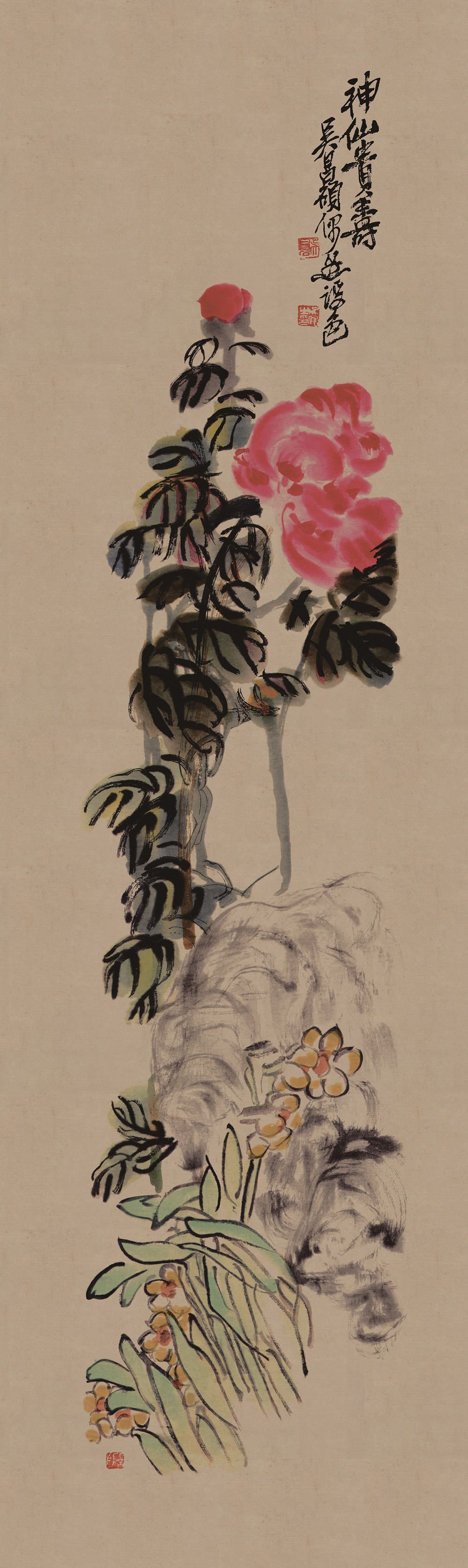 此幅描绘含露微嫩的牡丹,亭亭玉立的水仙。牡丹雍容华贵,花瓣层层叠叠,显富贵之意;淡黄色水仙花与嫩绿而修长的叶片,娇艳欲滴;似云似烟的湖石穿插于花卉中,灵动自然。画面题:神仙贵寿。