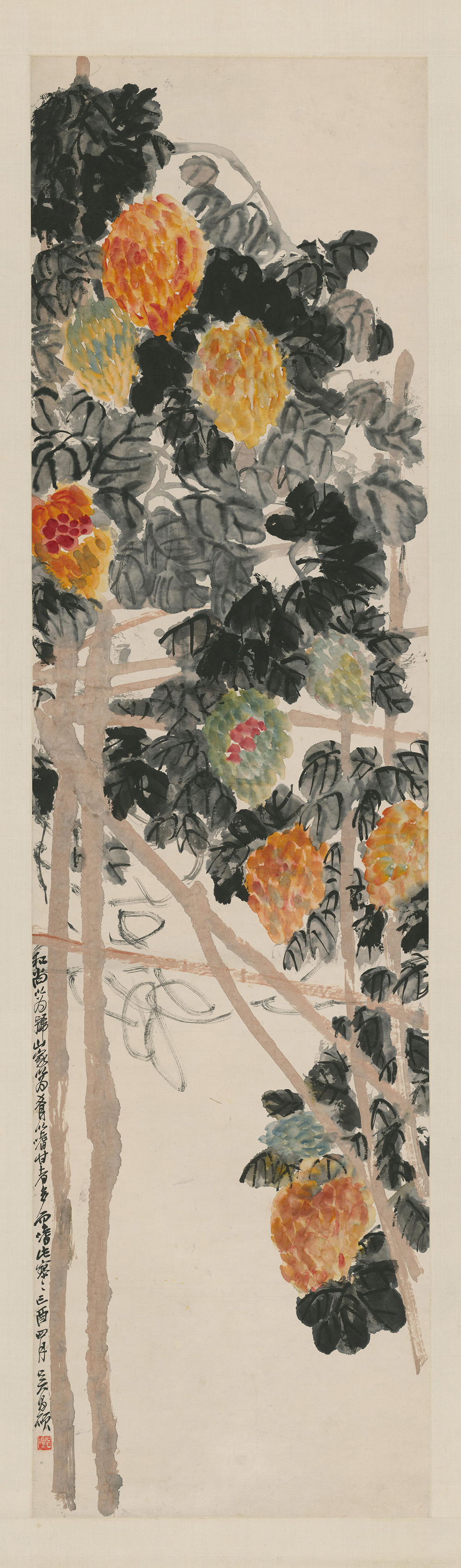 图绘苦瓜,有苦尽甘来之美好寓意。藤叶繁茂,攀枝而上,硕果挂满枝头。构图别出心裁,设色艳而不俗,笔酣墨饱,浓淡有致,为吴昌硕写意花果代表作品之一。