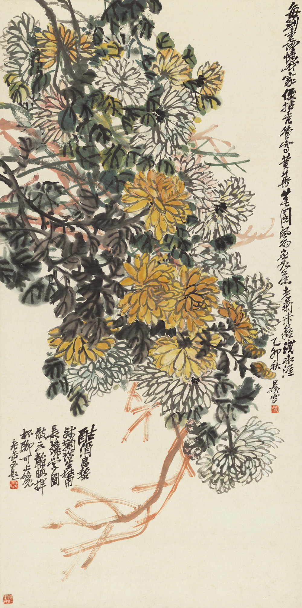 款识:“每到重阳忆我家,便拈秃管写黄花。芜园风雨应如旧,老菊疏篱浅水涯。”乙卯秋昌硕写。“酤酒昌黎残菊,谋生杜甫长才。学圃敢云韬晦,挥杯聊可上馋。”老缶又题。