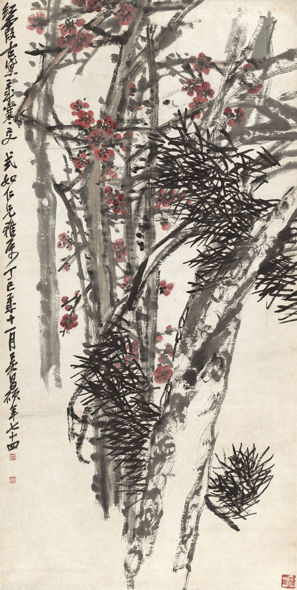 款识:红霞古黛风寒交。式如仁兄雅属,丁巳岁寒十一月,吴昌硕年七十四。
