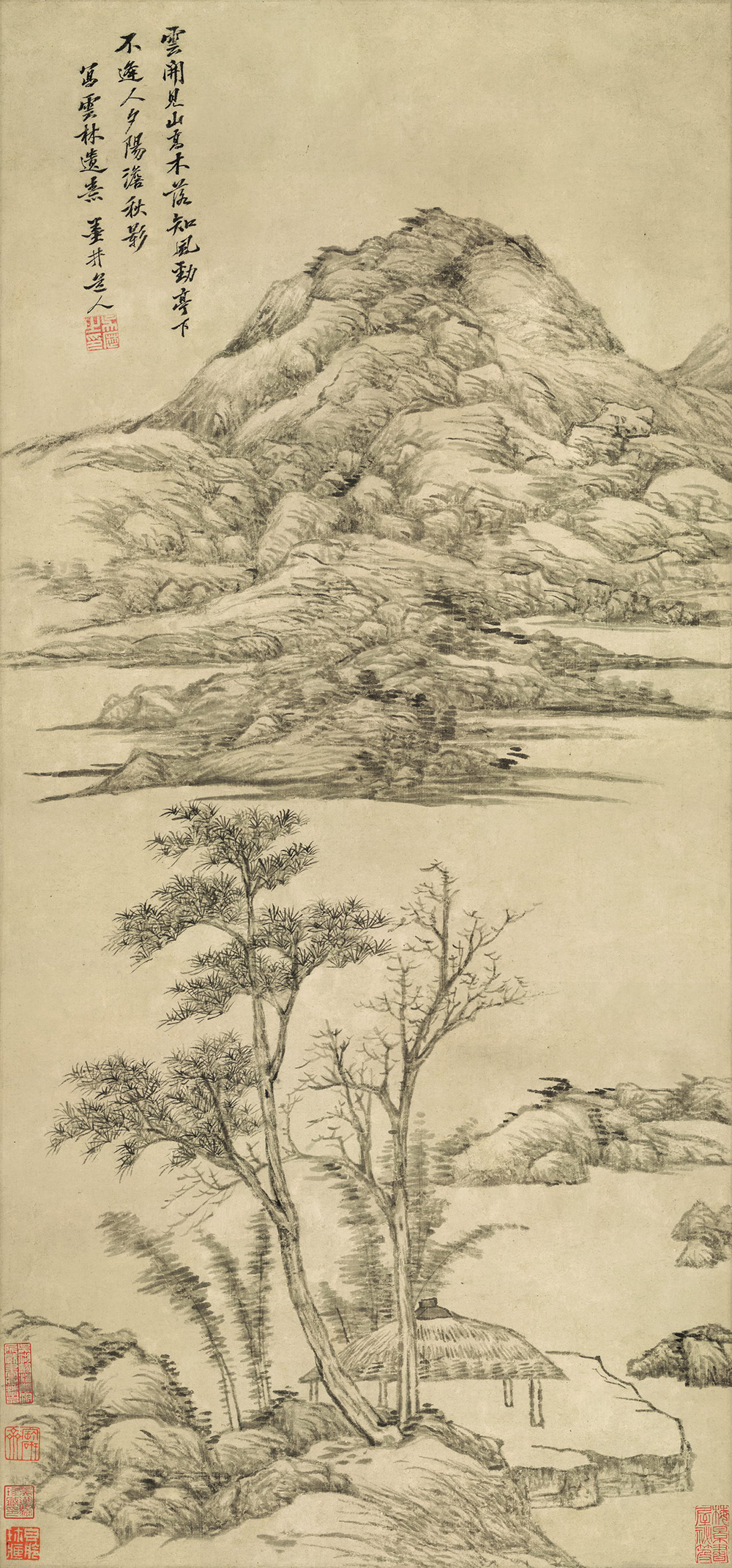 此图画山峦起伏,高树成林,草亭傍水,江天夕阳相映成趣。上有行书诗题及名款。此图虽仿倪瓒,然笔墨纯熟沉稳,颇见功底,诗画相融,其韵致超绝,具有自己的笔法,江亭遥岭,碎石丛树,萧瑟简淡,不失为吴氏晚年佳作。