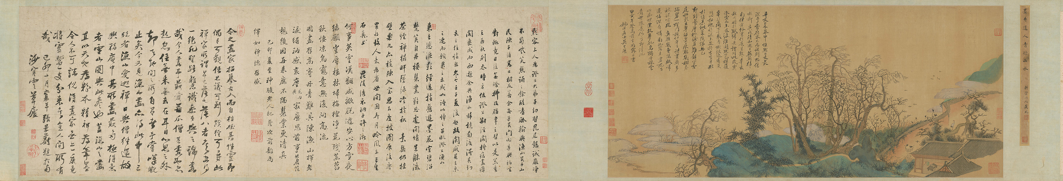 此图是作者为怀念故友默容而作,一段长题简述了二人的交往,情深意切。画中描绘兴福庵的景物,寺外杂树丛竹,墙内孤松白鹤,本是一处清幽之所,然人去室空,满目凄清,透露出作者以笔墨寄托哀思的心境。树木勾点结合,层次分明,穿插自然,蜿蜒曲折的围墙加强了画面的纵深感,山石有皴有染,大面积的青绿敷色表现了真实自然的景致,是画家兼取宋、元画法而别具一格的代表作。