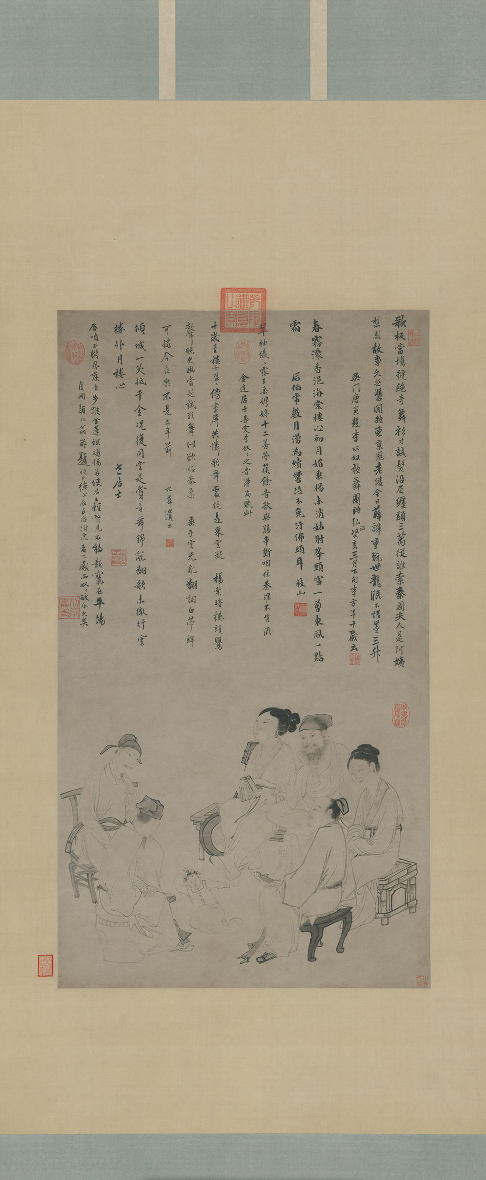 无作者款识。右下角钤“小仙吴伟”朱文方印。画幅上方有明祝枝山、唐寅、九华遗士、金庭居士、七一居士、髯九翁六家题。钤祝枝山“允明”、唐寅“唐伯虎”等印及清内府鉴藏印“乾隆御览之宝”、“御书房鉴藏宝”、“石渠宝笈”、“宣统御览之宝”等,共计10方。