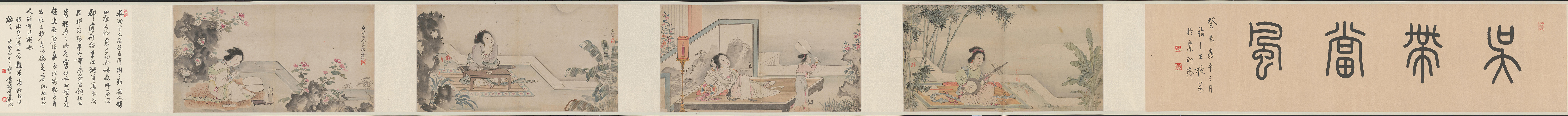 此卷四段绘竹林拨阮、庭院纳凉、倚琴望月和凝神题扇。作者在仕女形象上学习张路,女子均椭圆脸型,面容饱满,身形也较为丰腴。