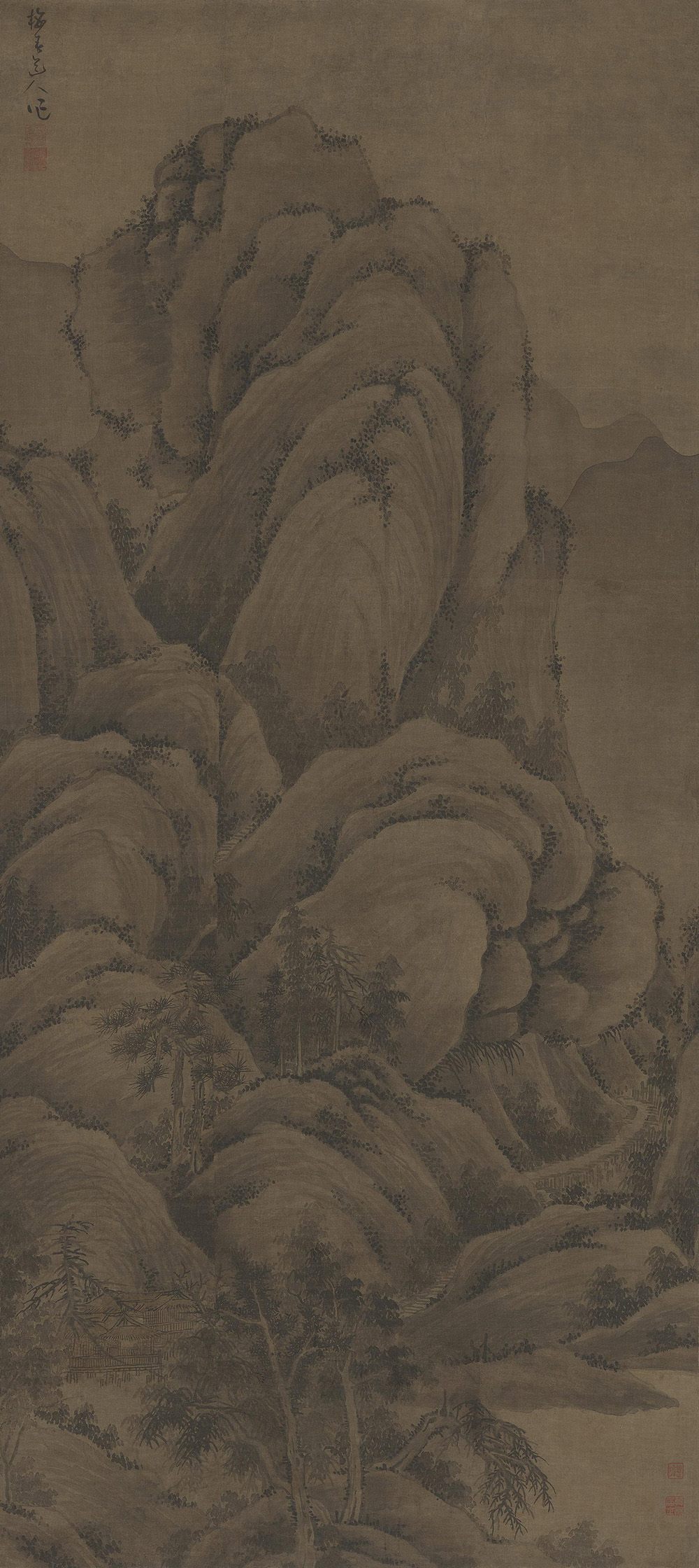 图绘高山巨石层峦重叠,远山云雾朦胧栈道顺山崖伸延,迂回盘绕,树林后溪水一湾,水榭半露,充满夏日中葱郁气氛,山石以水墨渲染,淡施披麻皴,圆点浓墨点苔。笔法稳健,墨气湿润。 全画构图呈长方形,上不留天,下不留地,构图虽饱满,但密而不塞,疏密相间,故布局十分得宜。
