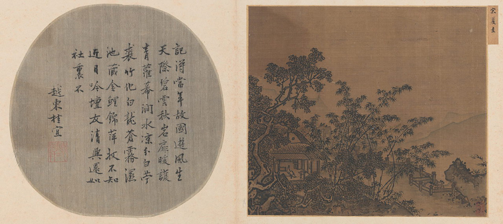 是幅为《宋元宝绘》册第五开。此开著录为:“浅设色画山水,无款印。”签题“宋夏圭”。左为圆幅。行书题:“记得当年故国游,风生天际碧云秋。岩扉暖护青萝幕,涧水凉分白苎裘。竹化白龙苍雾湿,池藏金鲤锦萍收。不知近日吟坛友,清兴还如社里不。”款署“越东桂宜”。钤“听雨轩”朱文正方印。