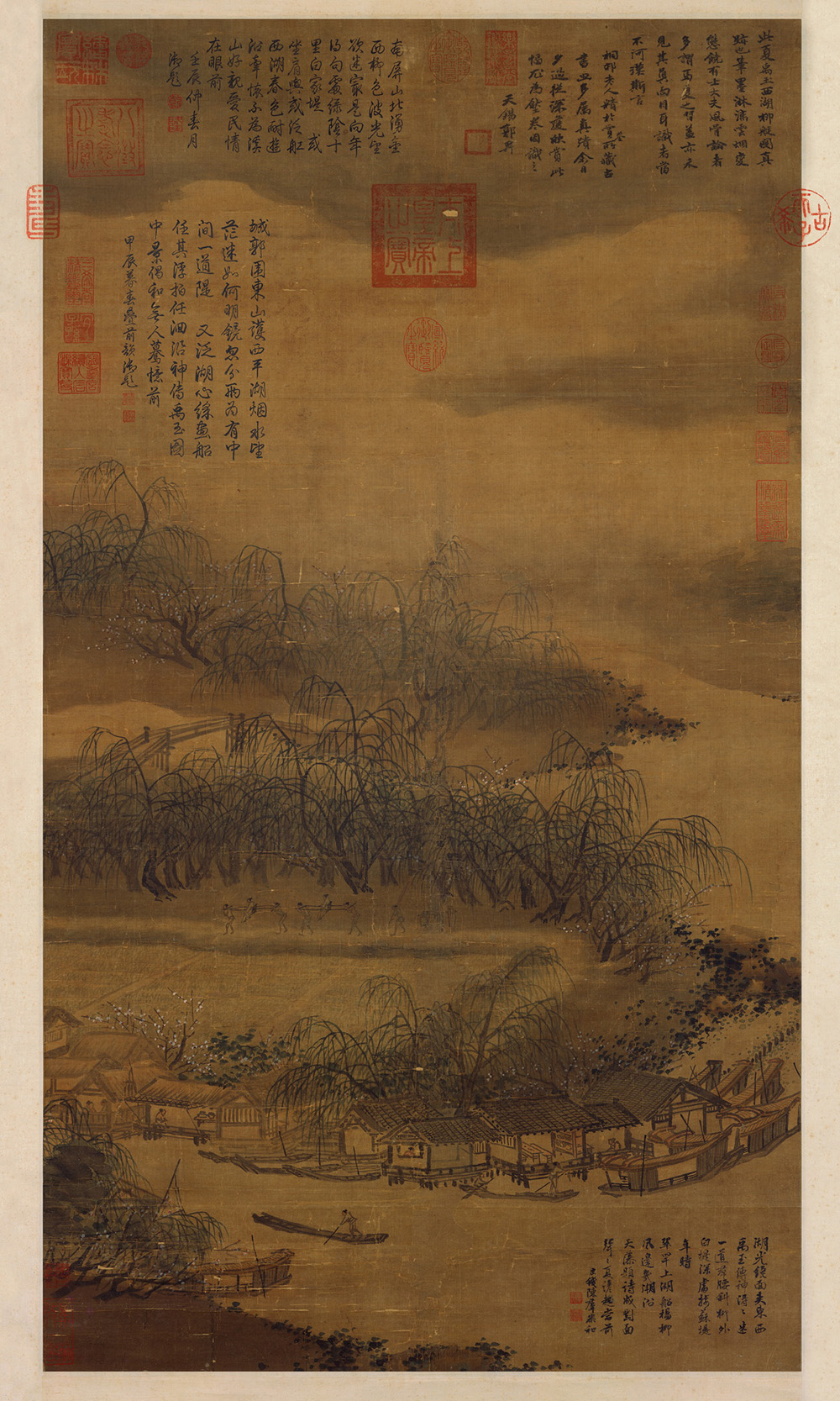 此画描绘的是西湖中的的湖堤、岸柳、茅舍、舟舫,从而构成湖边的村舍人家,一叶晚归的小艇正驶进湖湾。环堤而上,但见岸柳森然,木桥通幽,平渚柳林、烟雾高天尽收眼底。