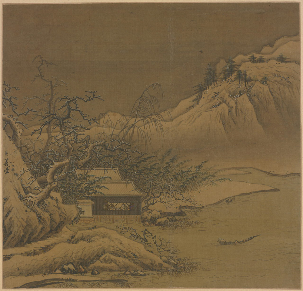 此图画江南寒江雪景。山村房舍为皑雪覆盖,寒气袭人。二人于室内对话。图中山峦用小斧劈皴和短线条秃笔,以表现山石方硬奇峭而又苍润浑融的质感。天空和水略染淡墨,以烘托大雪的洁白和寒气袭人的气氛。构图采用“边角式”局部取景法。全图笔法苍劲深厚、豪放典雅。