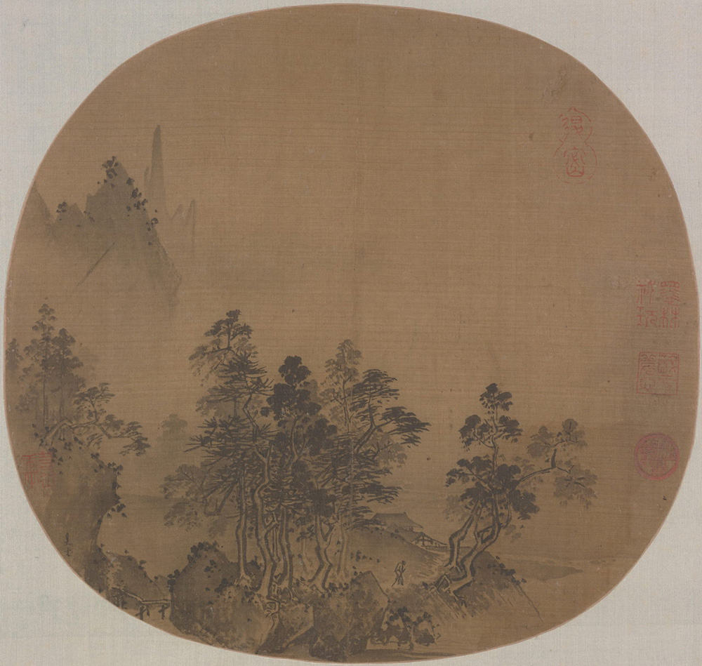 本幅自识:“夏圭”。钤鉴藏印“得密”(朱文)、“墨林秘玩”(朱文)、“醉兮姜心”(朱文)、“江村”(朱文)、“若水轩”(朱文)。曾经《书画鉴影》著录。图中绘一老者走过板桥,沿小径而行,远处山林后隐现房舍一角,意境幽深。近景树石着重墨,中景以淡墨勾染,至远景则以极浅淡的水墨渲染出一片雾色,拉开空间层次。用笔轻松简洁,皴中带染,染中有皴,整体风格不失精致秀润。构图是夏圭惯用的半边式。