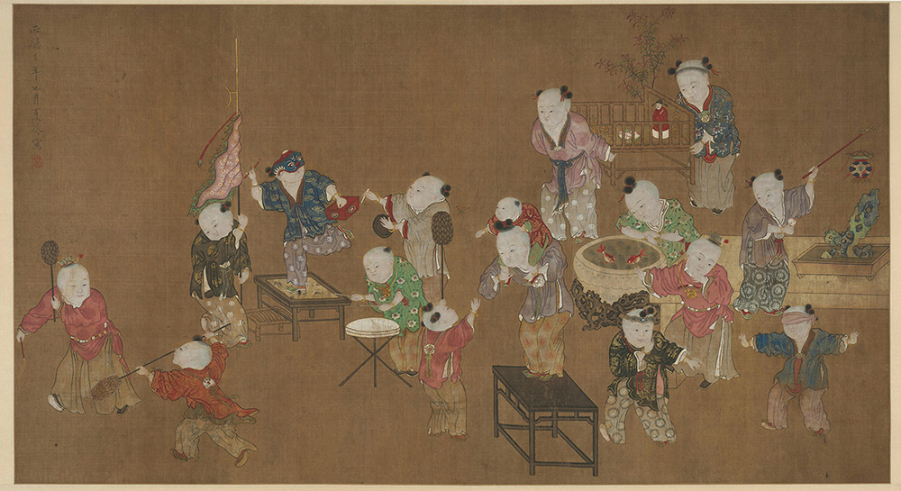 画卷左上题:正德三年七月夏葵寫。此卷描绘一群正在玩耍的儿童,画面热闹非凡,有敲锣的、打鼓的、捉迷藏的、观赏金鱼的、打灯笼的、习武的、持戟的、扮魁星点斗的……