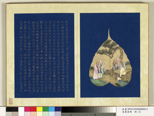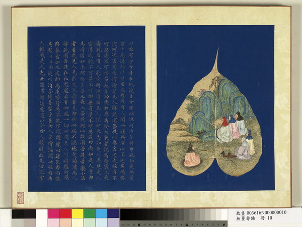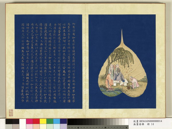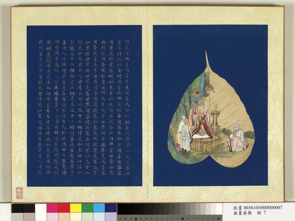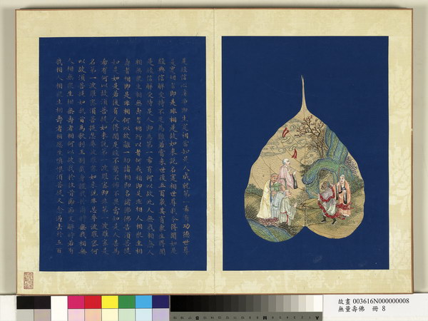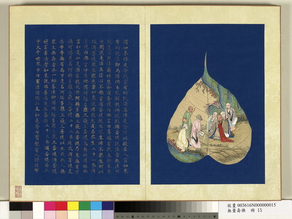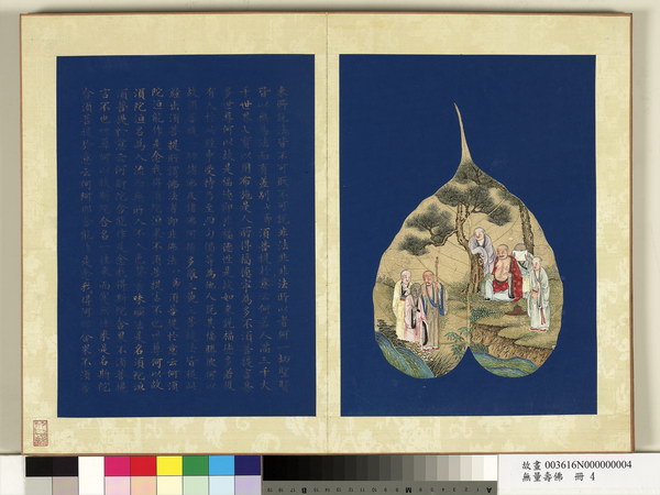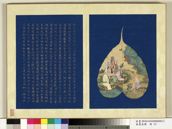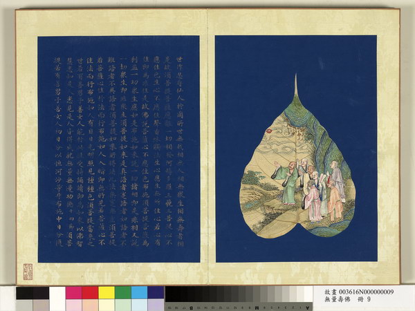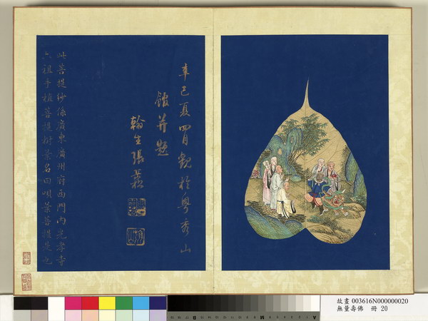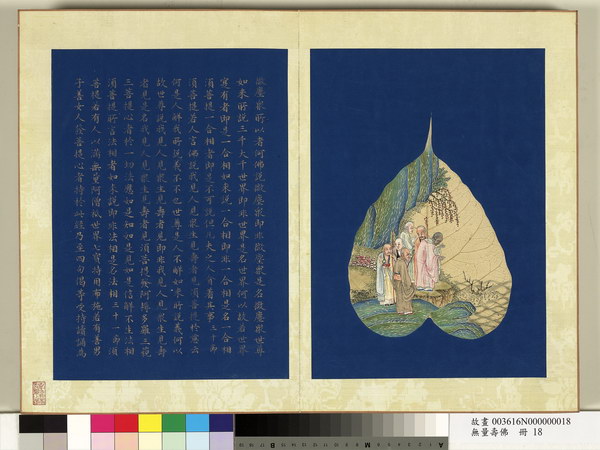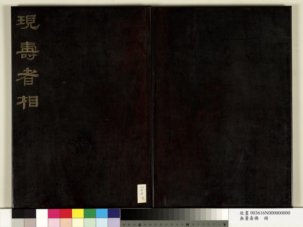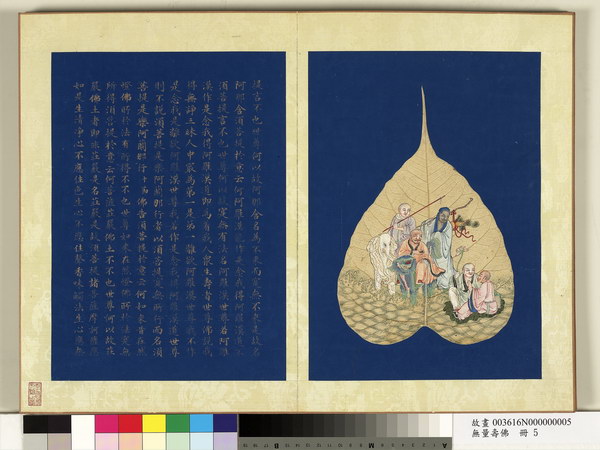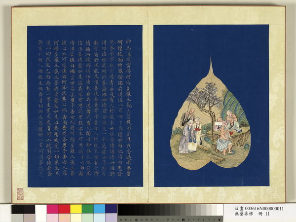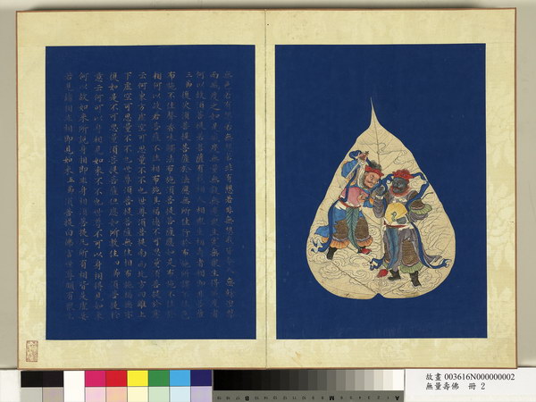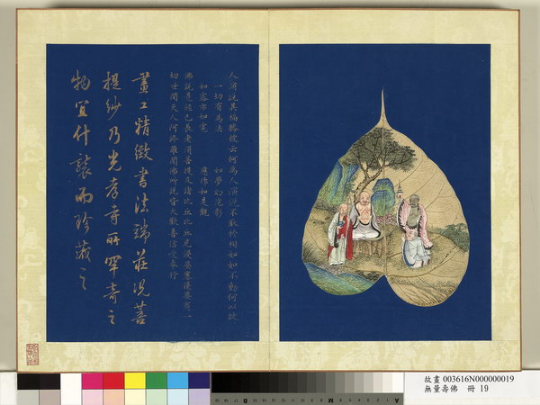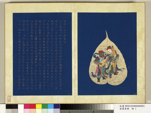 画册以诸天王、菩萨、罗汉事迹为题材,以菩提树叶为绘制素材媒介。全册共含二十幅,右为彩绘叶(广州府西门内光孝寺六祖手植菩提树叶)画,右为金粉写《金刚般若波罗蜜经》。函套楷书题签:無量壽佛。夹板题名:現壽者相