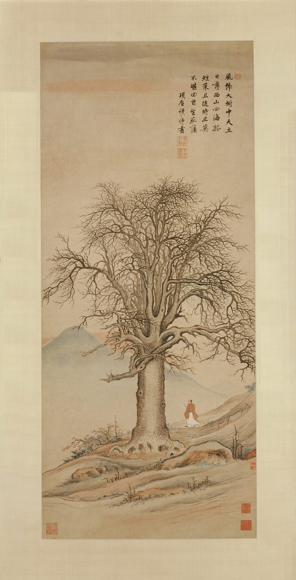 有学者认为此图是一幅寓意怀念故国的人物画,是项圣谟在明王朝灭亡以后创作的,表达了他对故国的怀念和寄托着深沉的哀思。图中近处陂陀上古树一株,参天独立,树下一老人携杖背向而立,仰首遥望远处青山和落日余晖,徘徊行吟,似不忍离去。图右上作者自题七言绝句一首:“风号大树中天立,日薄西山四海孤。短策且随时旦莫(同暮),不堪回首望菰蒲。”古树的形象塑造鲜明独特,背景简炼空旷,像是阅尽沧桑,饱经风雨,树叶虽经霜雪的摧残,飘零罄尽,但是却傲然挺立,有一种不可屈服的内在精神。整个画面包括诗题,给人一种沉郁、悲愤、孤寂、苍凉之感。